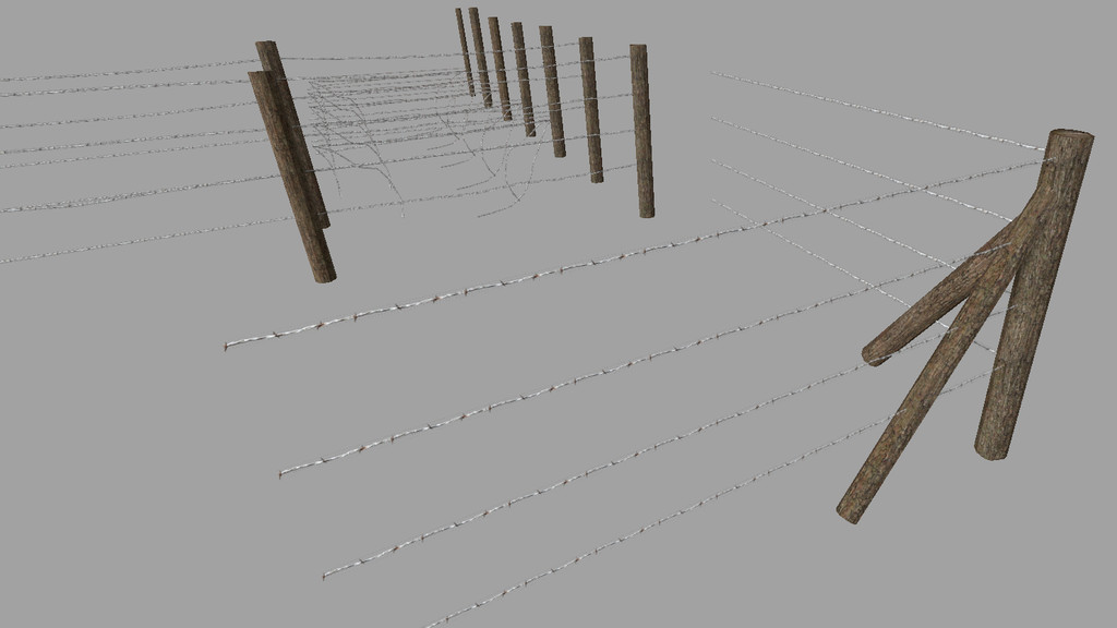 A simple barbed wire kit for placement within your maps. There are a set of variations and 2 prefabricated pieces, each piece has optional barbed wires at the end for attachment to another piece, and any unwanted parts are to be deleted. The kit has been set up with LOD’s and already set to 350 clip for the posts, and 160 for the wires. There is also a corner piece which will make less time for placing parts together to prefabricate it yourself.