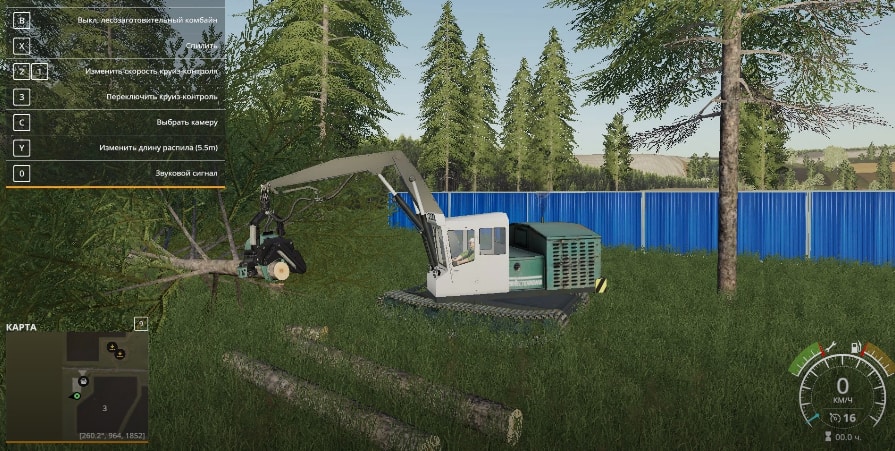 – Engine power 316 horsepower; – Maximum speed 15 kilometers per hour; – Working lighting, rear light; – Animation of the dashboard, animation of controls; – Leaves traces and dust flies from the wheels; – In the game, its value is 250,000 euros. Modification LP 19B3 v 1.2.0.1 for Farming Simulator 2019, is a logging machine that can overload logs, saw off branches, cut trees into logs of different lengths.