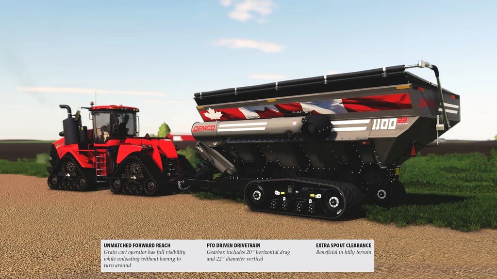 In 2019, Demco introduced the “22” Series Grain Carts. These large capacity grain carts are unmatched in the industry with convenient features, first-rate quality, and excellent efficiency for your harvest operation. The “22” Series Grain Carts are available in 1100+ and 1300+ bushel capacities.