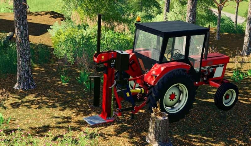 You can use this logsplitter to split trees up to 1 meter length. The logsplitter is operated from the outside, the tractor has to run. For that reason you have to deactiave the automatic engine start in the options, so the tractor stays on when you leave it. Operating this logsplitter is really easy. Just unfold and turn on the logsplitter (from inside the tractor), then put a wood piece on the logsplitter, walk to the levers and push the key that shows up in the help menu! As soon as the wood is split you can release the key and the split cylinder goes back automatically.