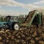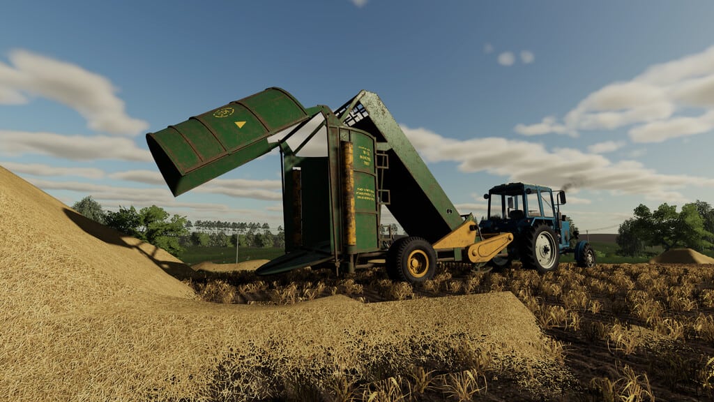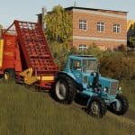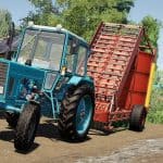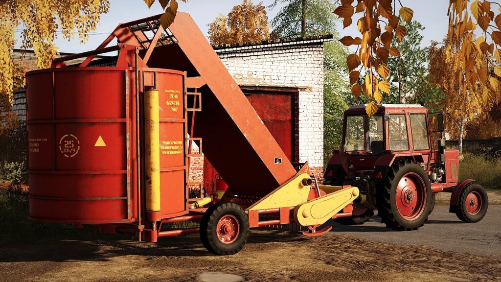 The PK-1,6 picks up hay from the swath, forms a cylindrical bale and places it on the ground. In the game, it performs the standard functions of a forage pick-up trailer.
