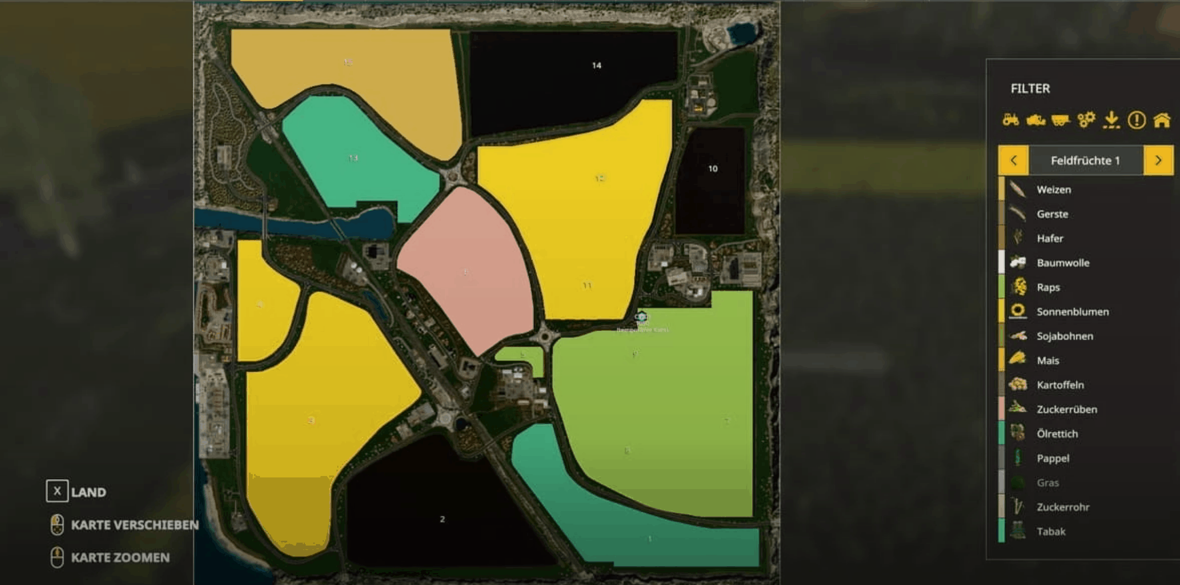 At the start of the game you have two fields (5, 11) that are ready for harvest plus the meadows on the farm, a total of 15 fields are available from 1ha to around 32ha.