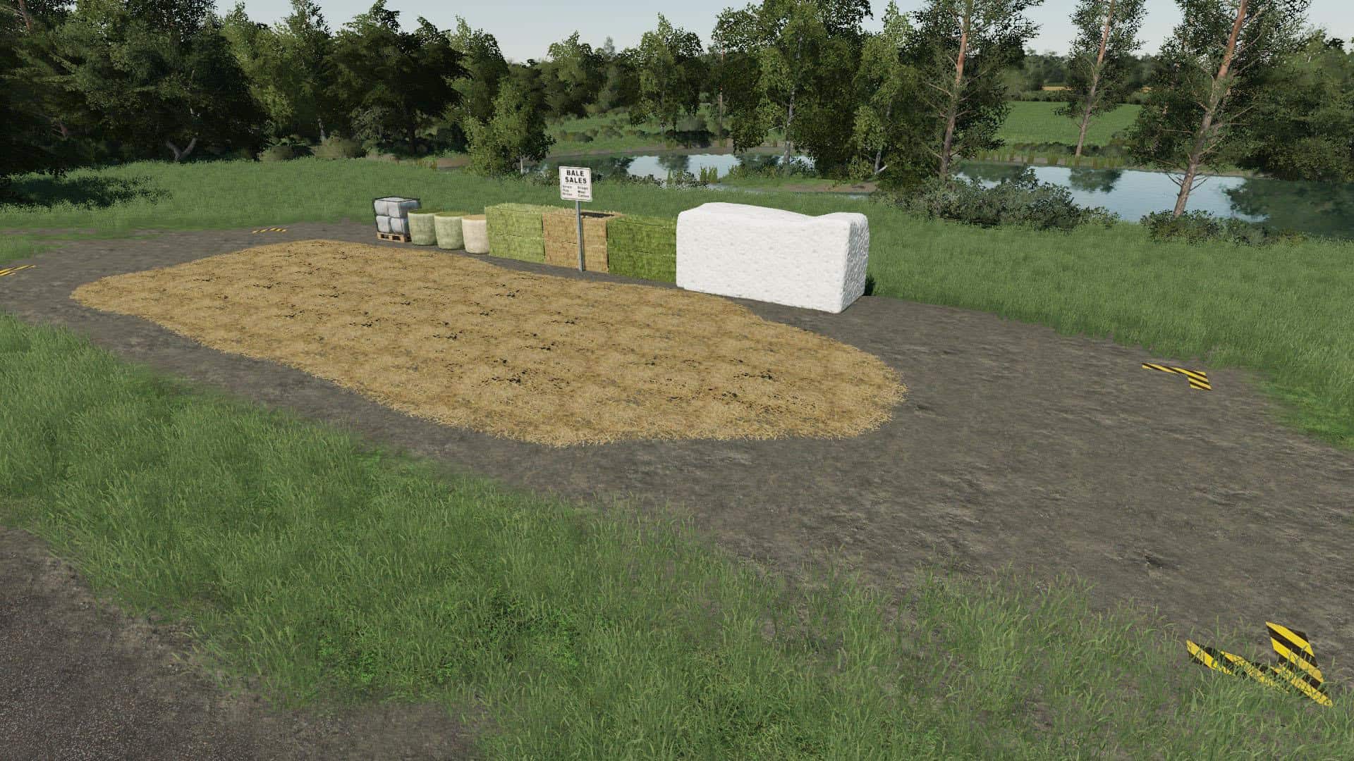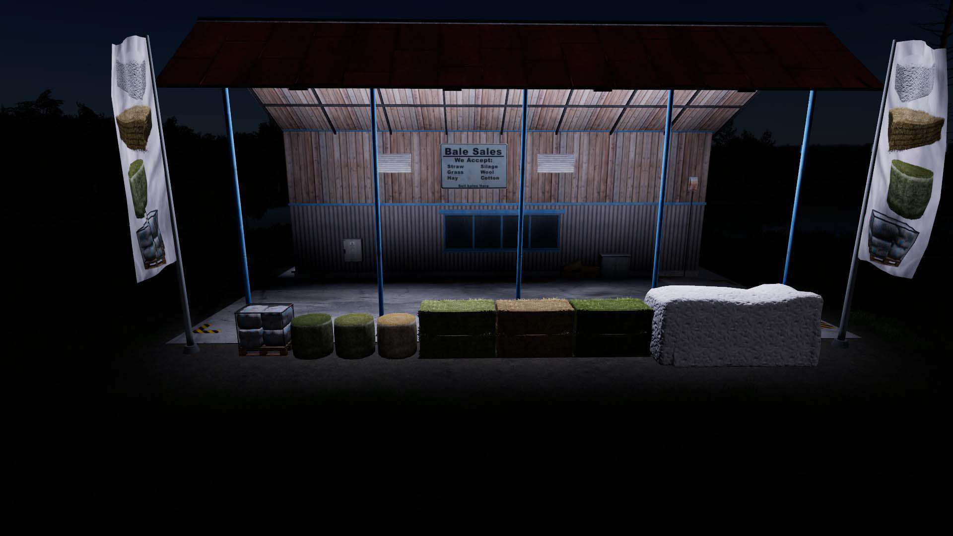 This is a placeable sell point for all bales and cotton modules with included wool pallets. Loose straw, hay, grass and silage is also excepted. Available with or without building, includes four placeable sell points, two with leveling for a static placement and the other two without leveling and clearing area, this will allow you to place the no leveling sell point on a field without damaging or clearing the crop or field, ideal if you just want a selling point quickly where you are working.