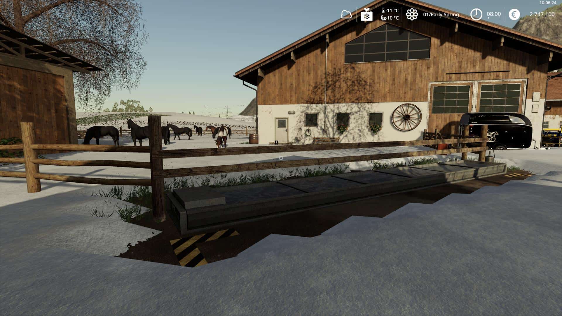 16 Horses, Barn (from Thomas, LS19 Gebaude Pack v1.1.0) for Straw and Hay bales. Feeding, straw and wather from front. Small clear area. Night Lights and litlle bit deco.