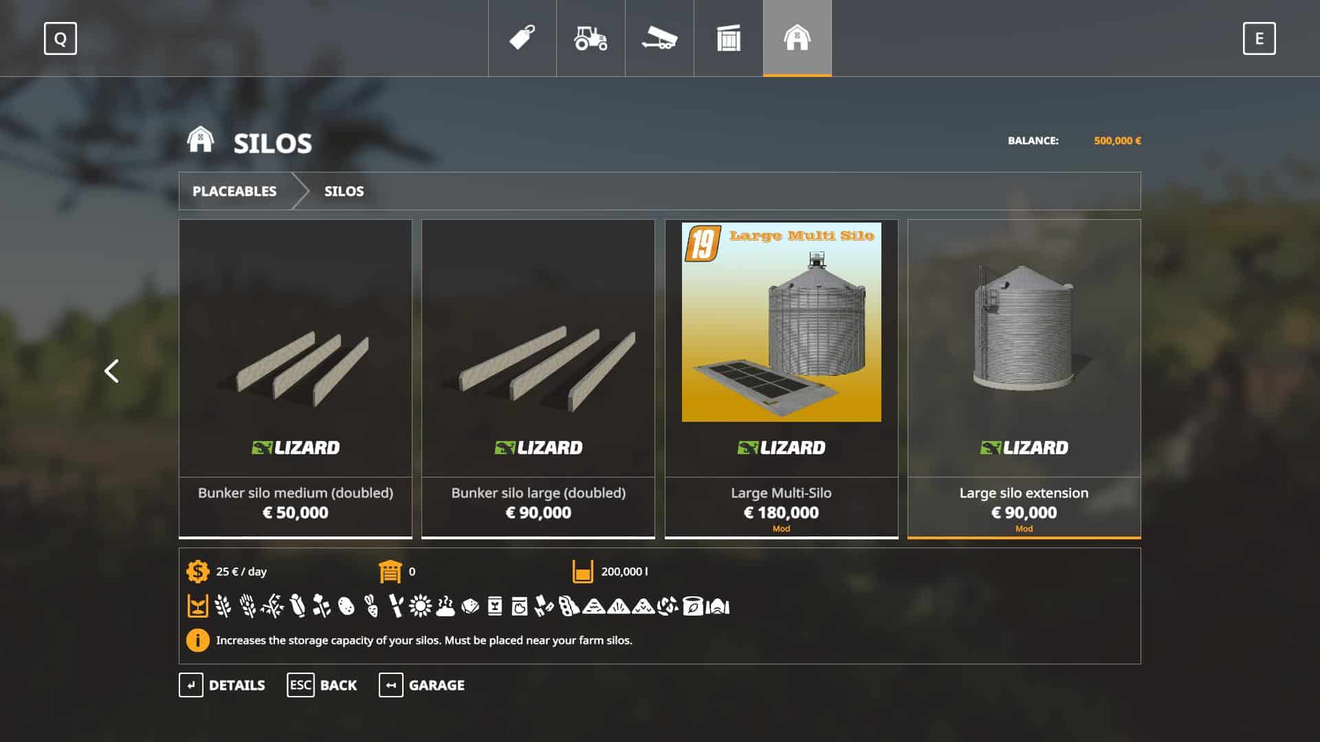 Added Silo Extension to increase capacity and keep things somewhat realistic with having multiple graineries. Credits also go to Pandahma as it was his Large Multi Silo mod I added this addition too. So this now is a complete Large Silo storage with Silo Extension capabilities. Will store the following types “wheat barley oat maize canola potato sugarBeet sugarCane sunflower manure lime seeds pigFood woodChips soybean dryGrass_windrow Grass_windrow straw chaff fertilizer silage”.