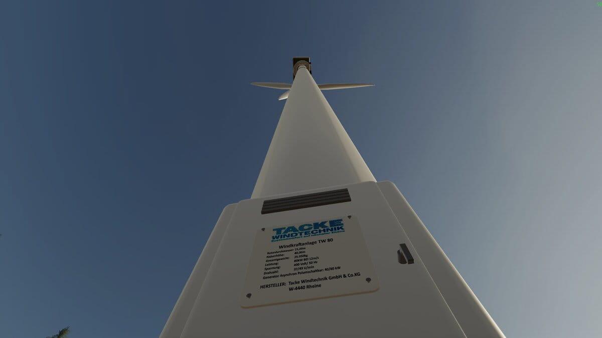 Here is my wind turbine from the former German manufacturer Tacke, of the type TW80, which is actually very close to a farmer. You can find the system in the shop under “Placeable Objects” in the “Miscellaneous” section.