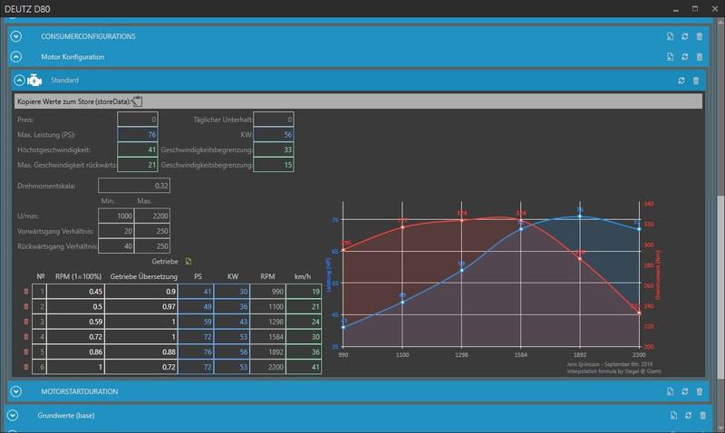 The engine editor has been radically changed, all the calculations are now using the new formula (thanks asyvan) and accurate. Power and speed now depend on the parameters of torque (normRpm, torque), this change allows you to get the actual result of the configuration, and not just the engine itself. This is a test, but quite working, version of the editor, work on it will continue.