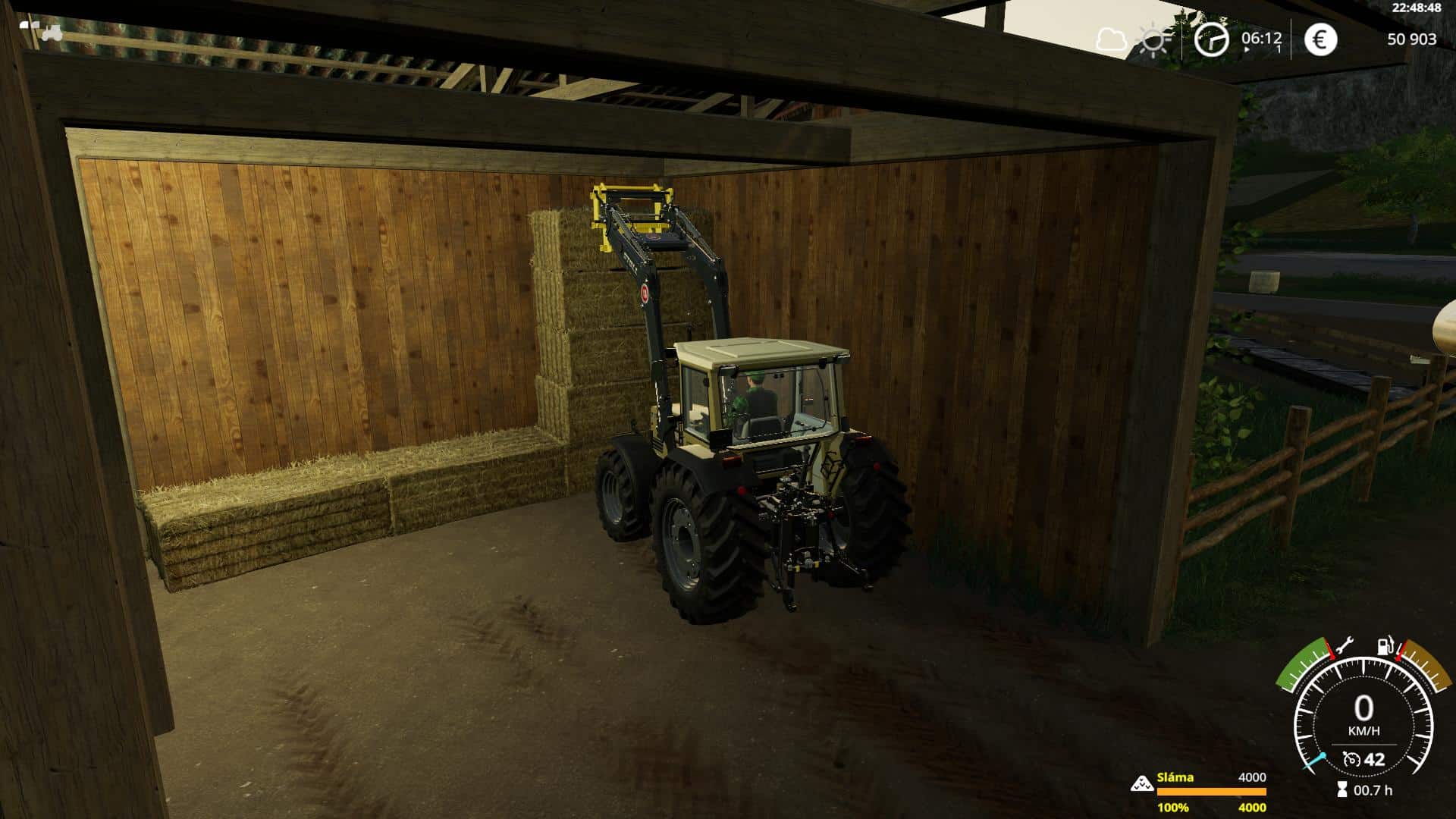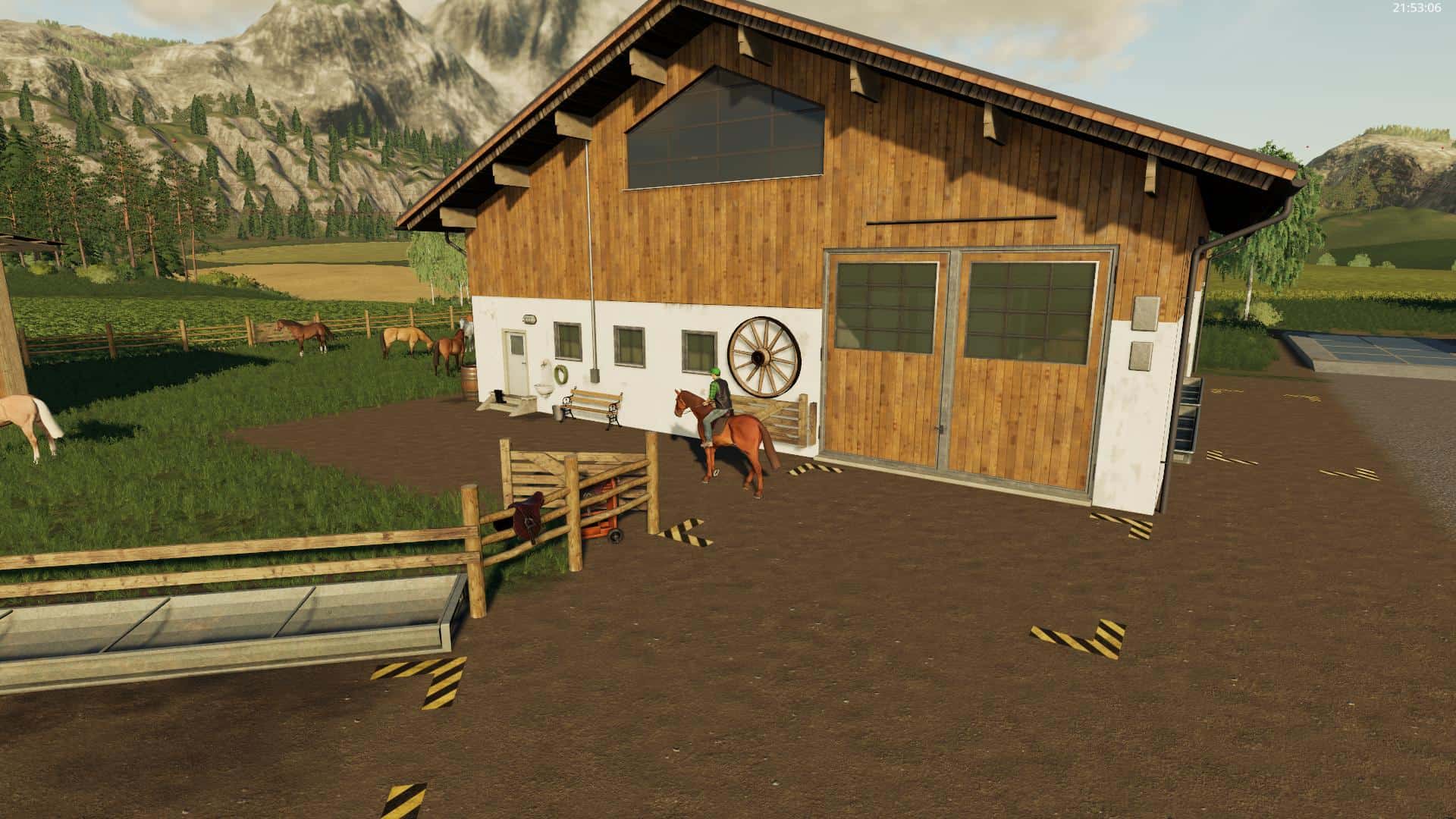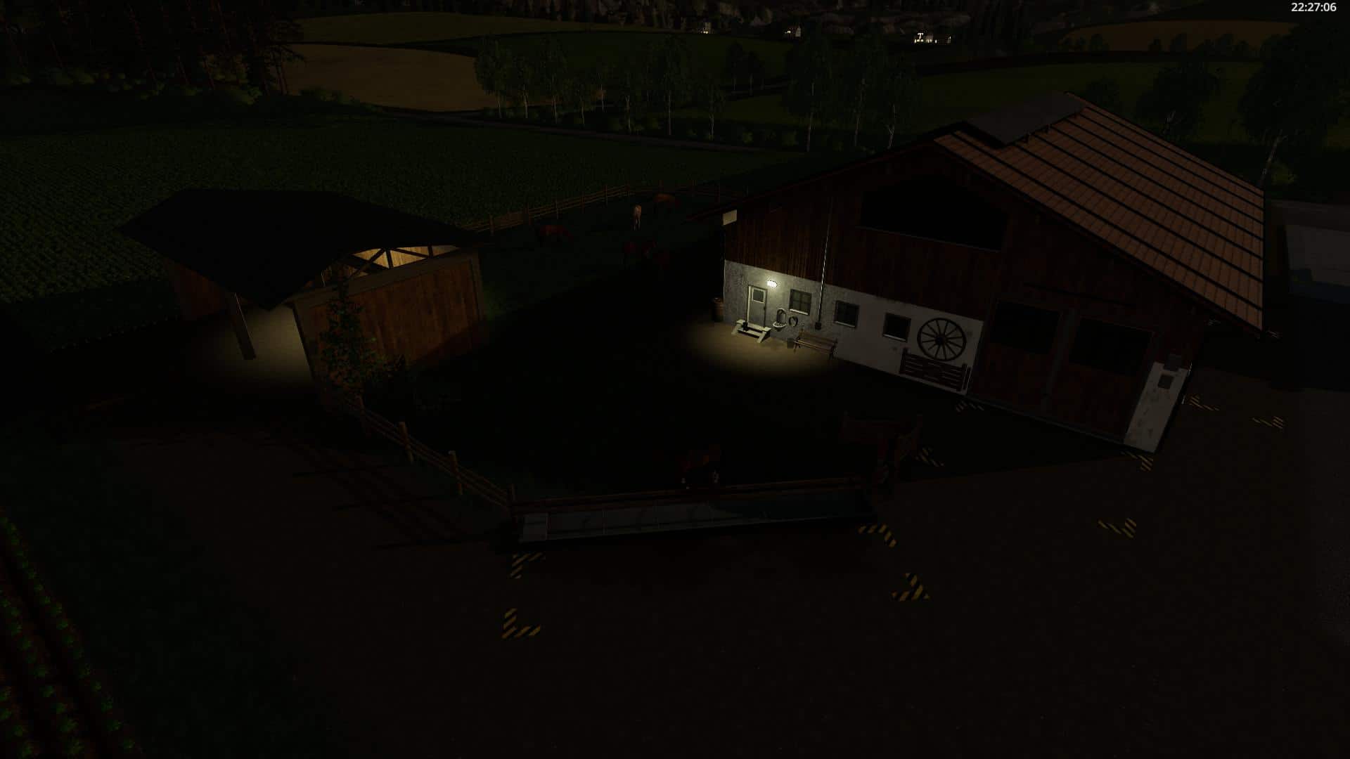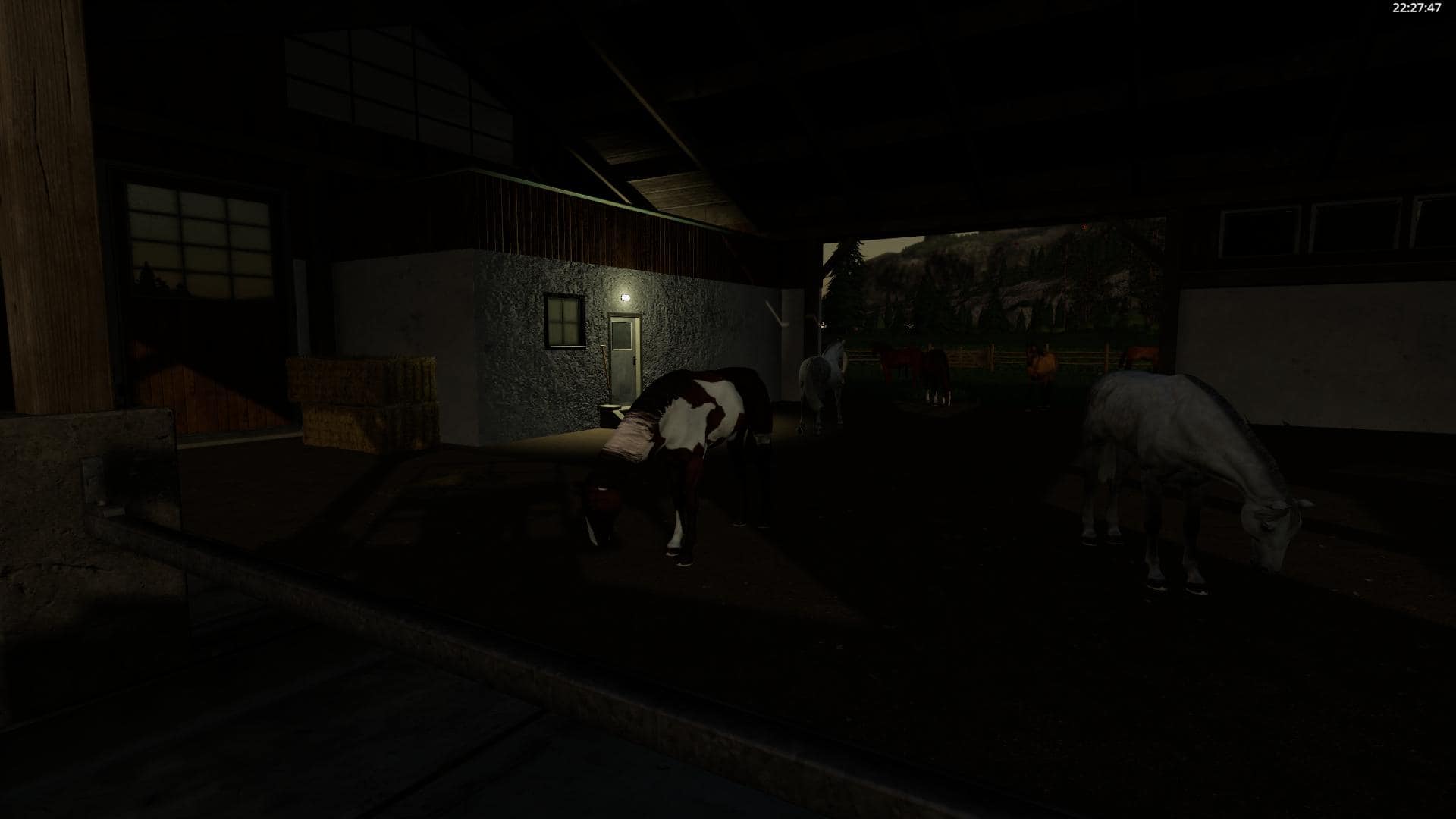 12 Horses, Barn (from Thomas, LS19 Gebaude Pack v1.1.0) for Straw and Hay bales. Feeding, straw and wather from front. Small clear area. Night Lights and litlle bit deco.