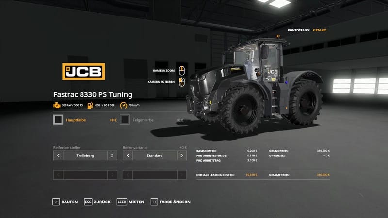 I took the standard JCB out of the game and equipped it with 500 hp as well as the possibility to exchange colors and rim colors. You can now use it in any standard color you want.