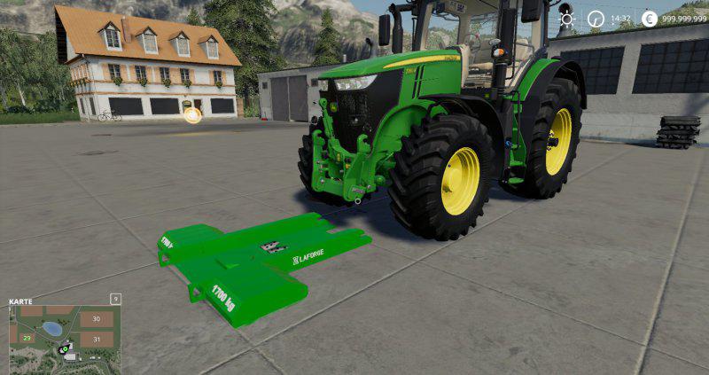 The EZ ballast underfloor ballast can be attached in a few seconds without having to get out. Simply drive the tractor in front of the weight and lower the catch hook. To do this, hold down the left and right mouse button and push it forward. When the EZ-Ballast catch hook is all the way down, drive the tractor over the weight. Connect with Q and fully lift the weight by pressing the two mouse buttons and pulling back the mouse.