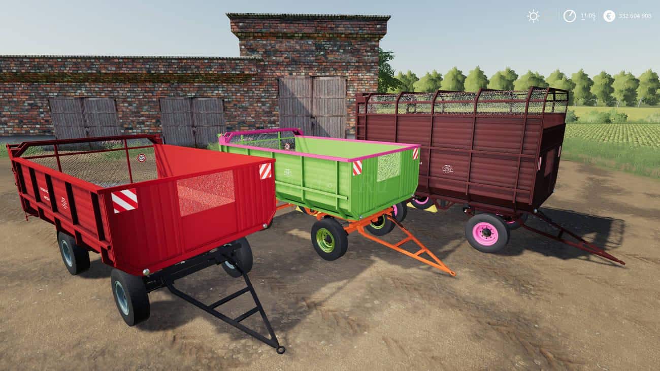 PTS Feed Trailer Truck with auto-feed, for playing Farmer Simulator 19. Has a choice of colors from the store in four designs, and just choose a flatbed body or with a roof.