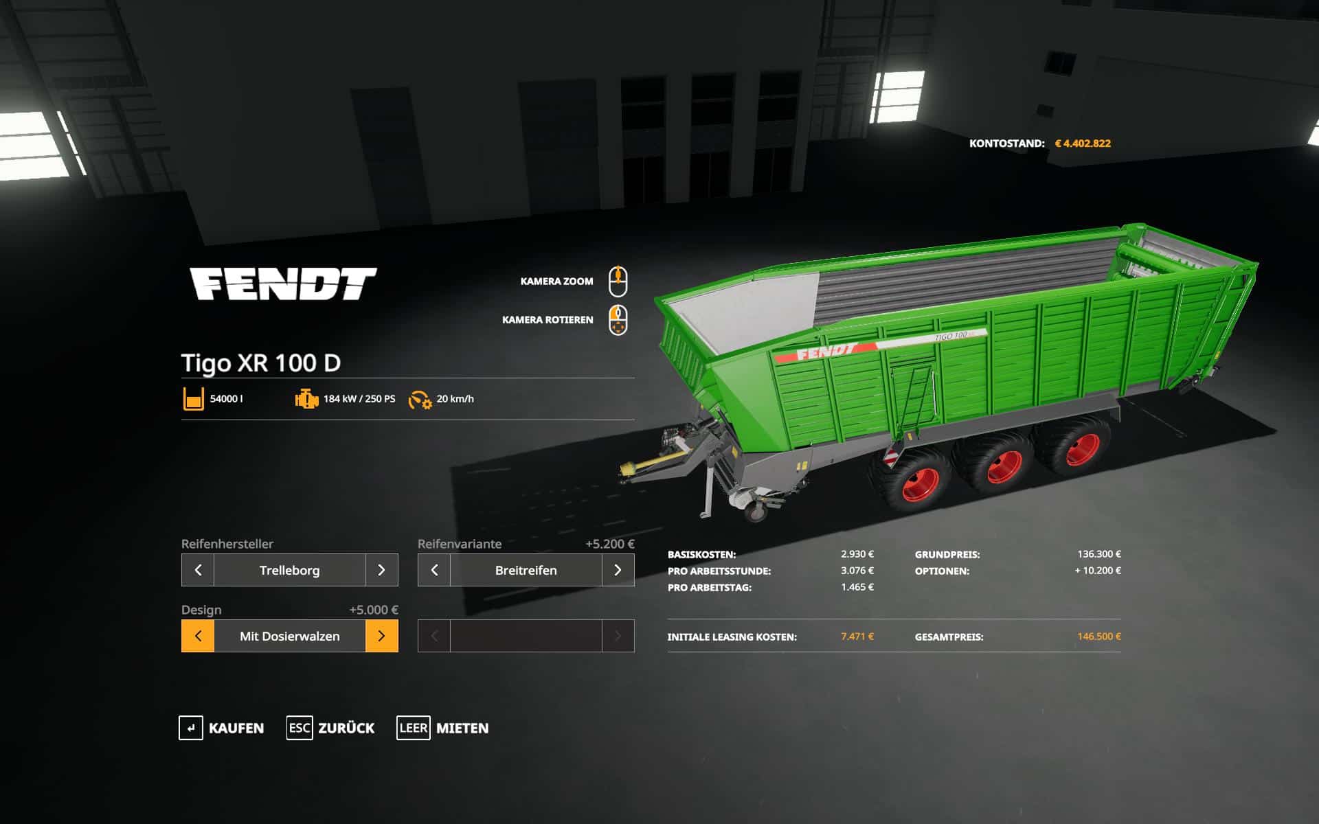 You can choose the capacity after purchase (default key K). 54000, 75000, 100.000Liter. Choose wisely, depending on the material you transport. Once you started to fill it, you can’t change the capacity anymore. You’ve to unload it first.