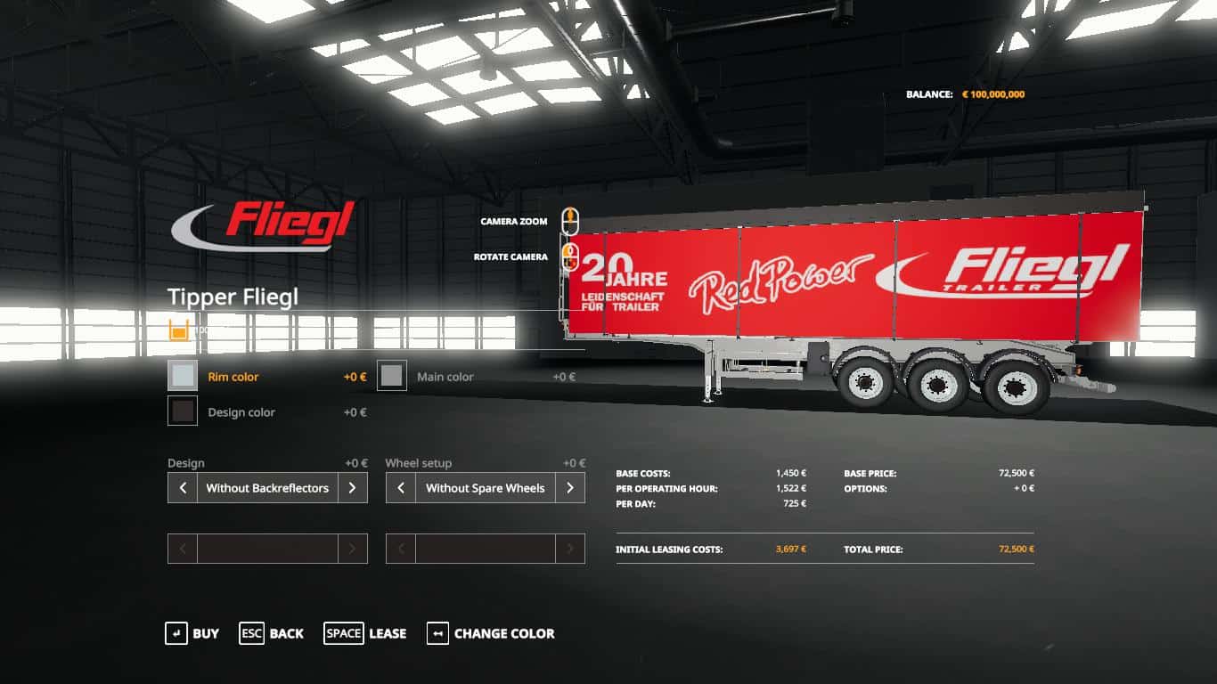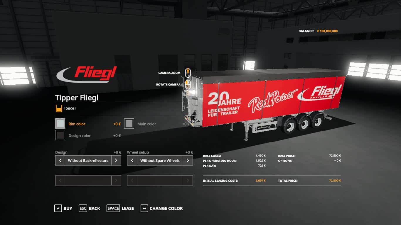 Capacity: 63000l – Price: 72500 – Press X to unfold the ladder (you can climb it up to take a look into the tipper) – lift axle – Color selection for the trailer, the cover and the rims – Configuration for reflectors at the backdoors – Configuration for spare wheels Please be aware that this is a tipper trailer which may not be good to use in small buildings. Tipping angle is 37° (normal) or 18° (tipping via graindoor). Max. height while tipping is 9,6m (normal) or 7,1m (tipping via graindoor) which is close to real world values.