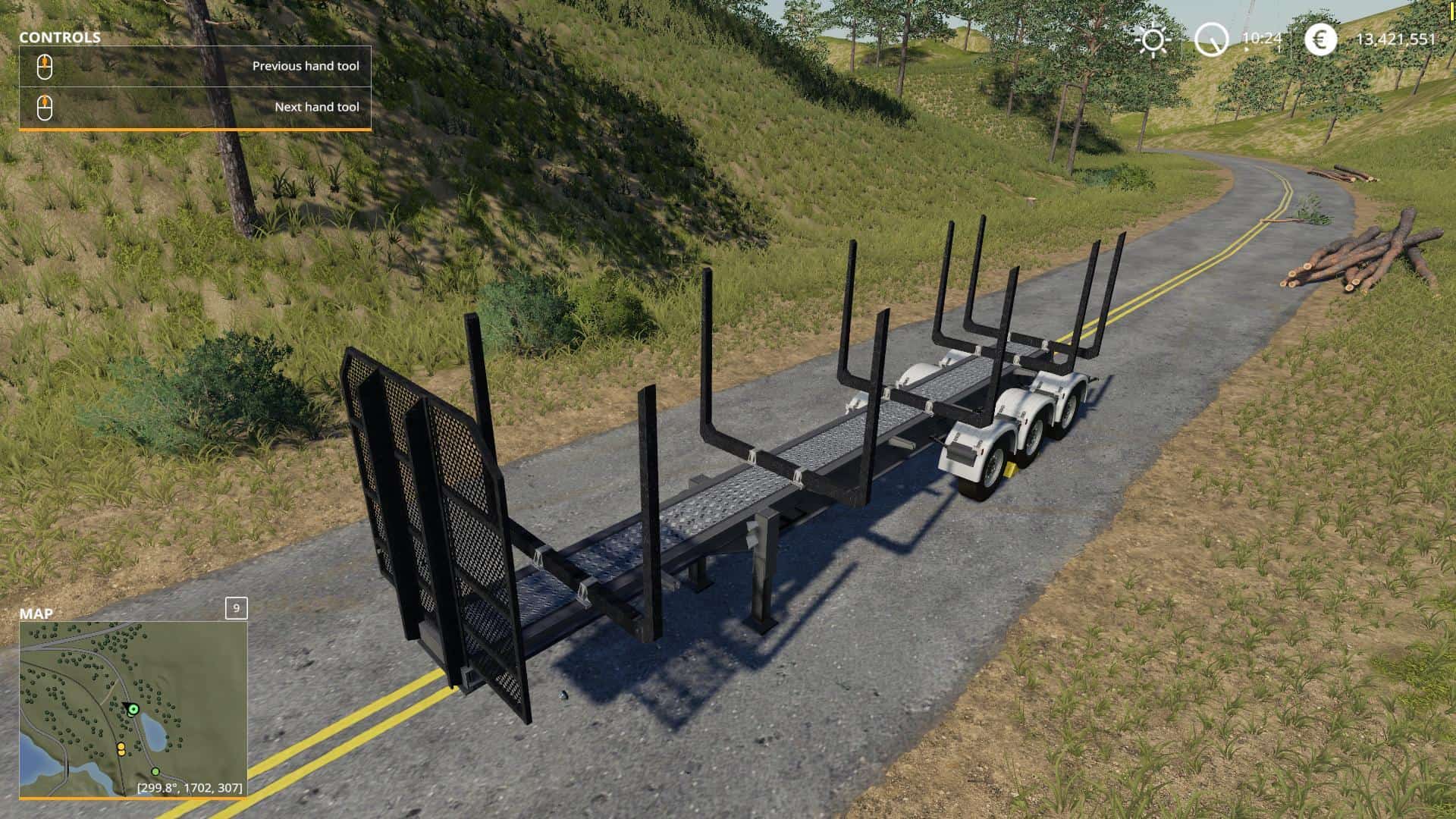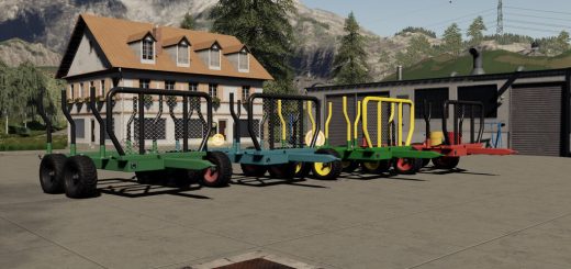 This is 12m log trailer with autoload wood script (orig author Marhu). It has large space between forks, so it can be loaded by whell loader or big arm loader.
