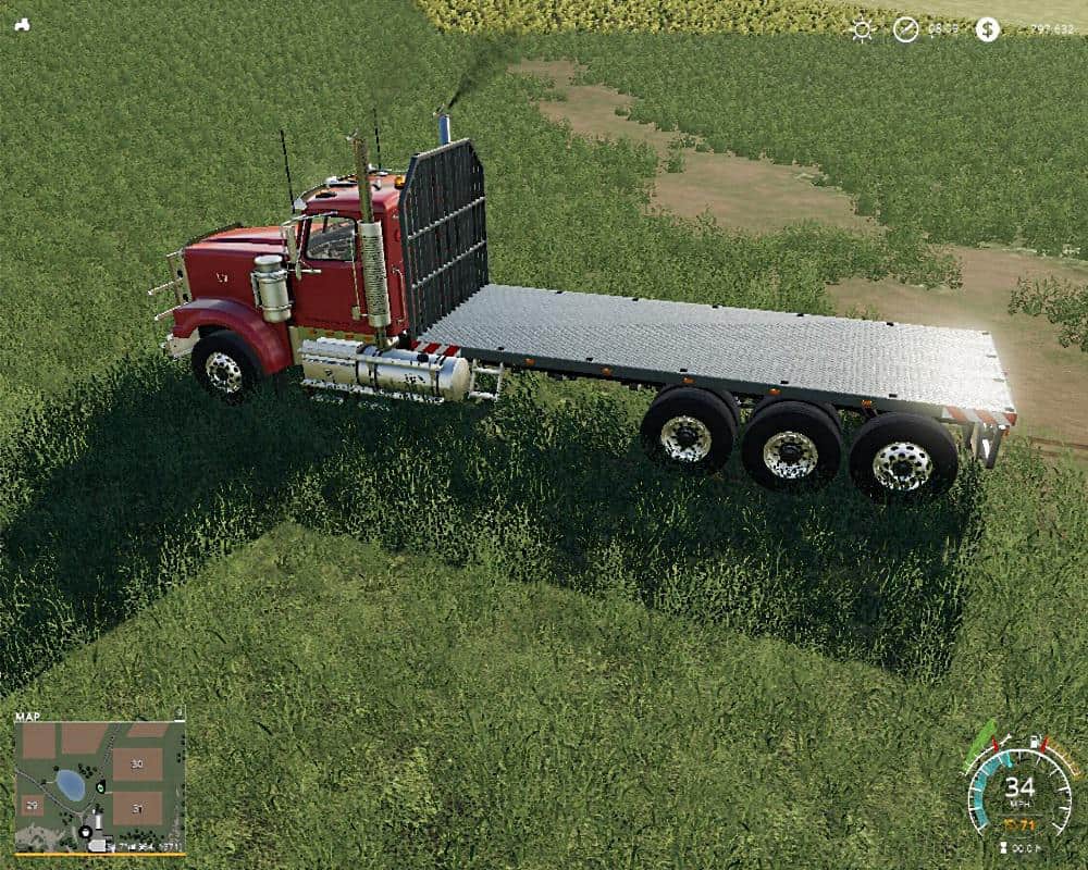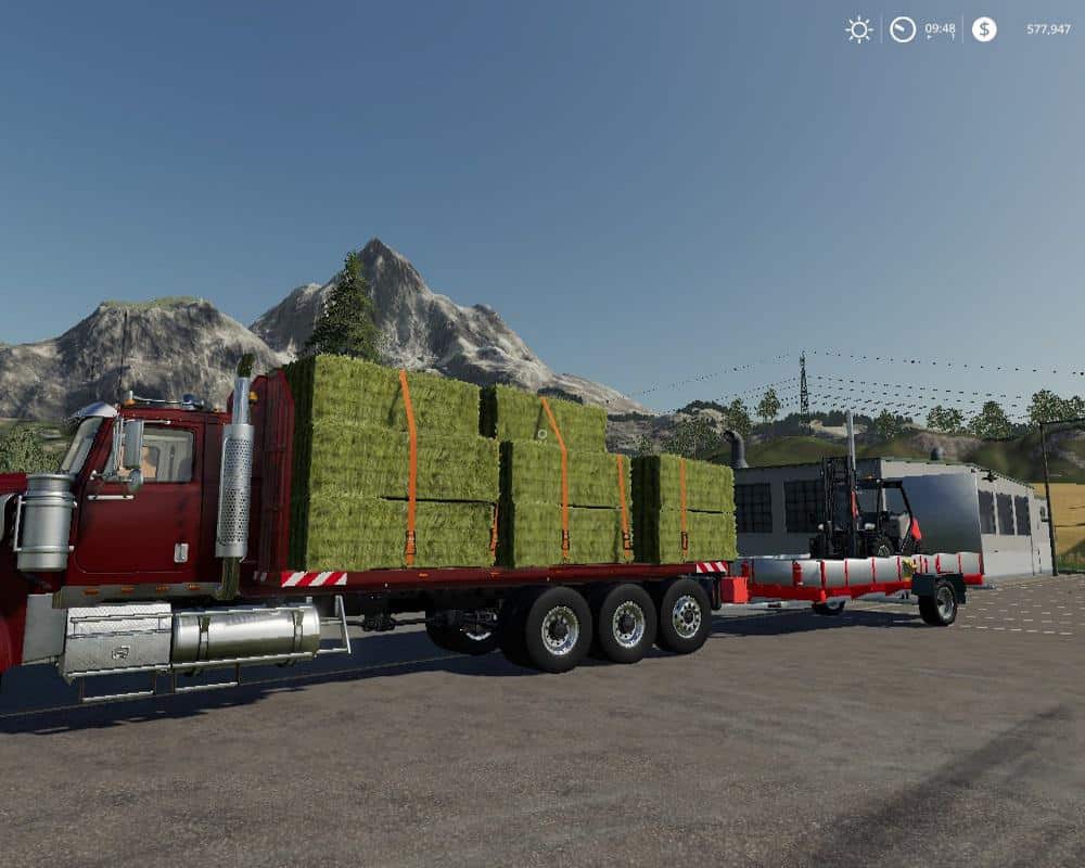 Giants vanilla Hulk edited to become a flat bed. The frame has been extended to accommodate a 24 ft flatbed. The bed is equipped with tension belts and will hold between 15 to 18 large square bales depending on how you stack them. Plus you can load any other pallets and items that can be