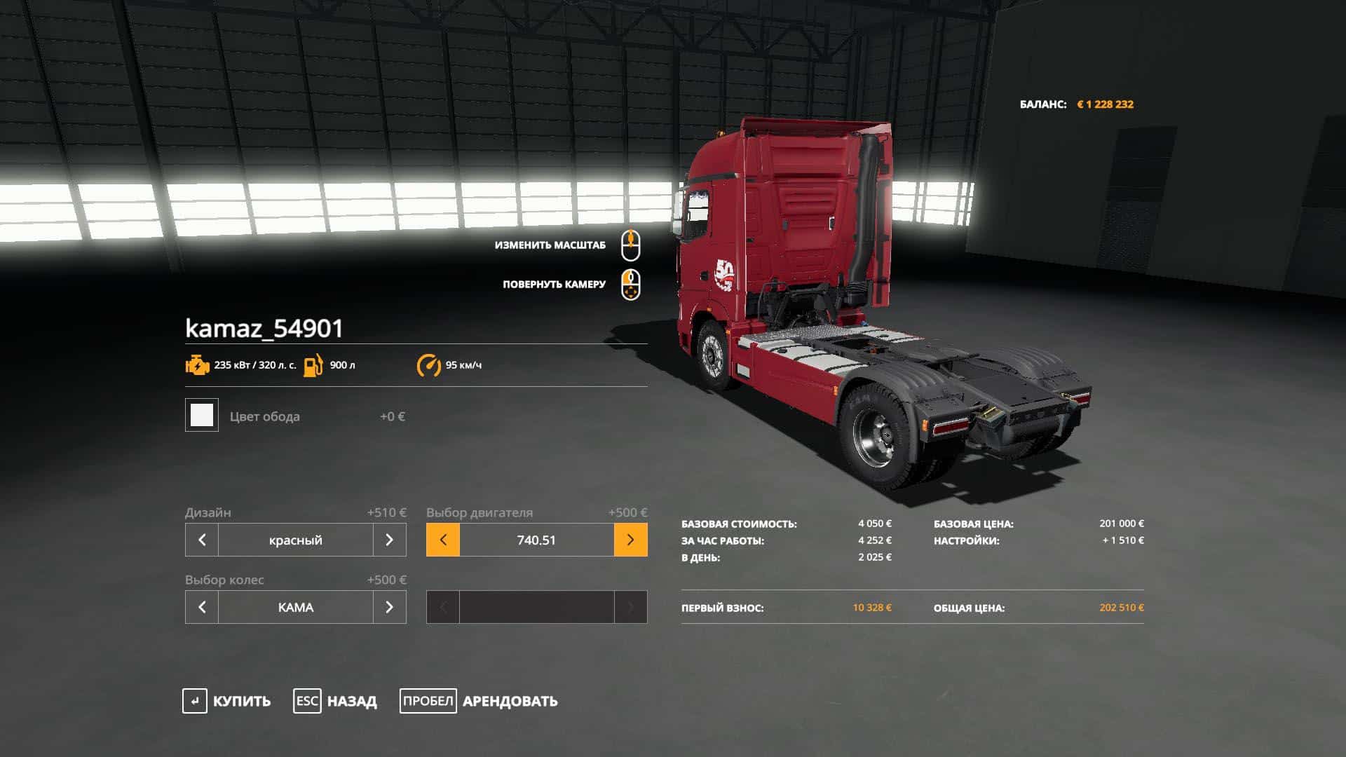 The mod has a choice of engine (two types), a choice of wheels (4 types), a choice of five skins, lighting equipment, dashboard animations, dust and tire marks.