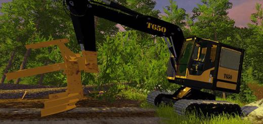 Verfolgen Sie Mähdrescher Cat 501HD, Forstschlepper . Im Verlauf der Bewegung zeigt den Staub und hinterlässt Spuren.