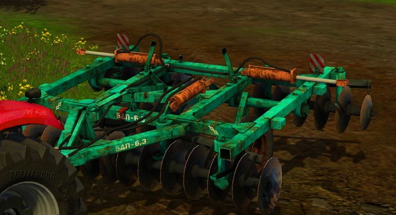 Trailed disc harrow, in the course of processing fields shows dust and earth.