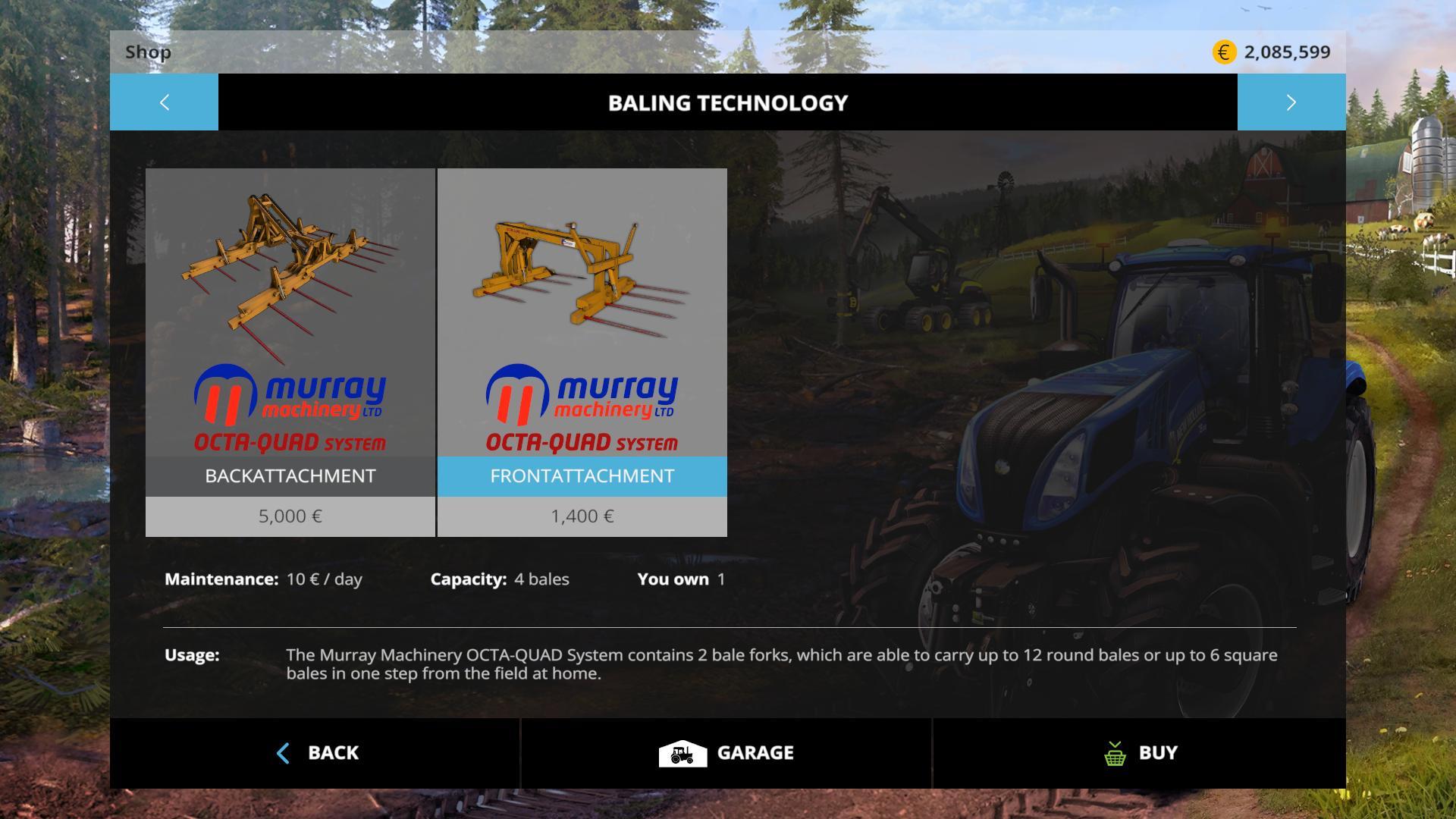 The Murray OCTA-QUAD System contains 2 bale forks, which are able to carry up to 12 round bales or up to 6 square bales in one step from the field at home.