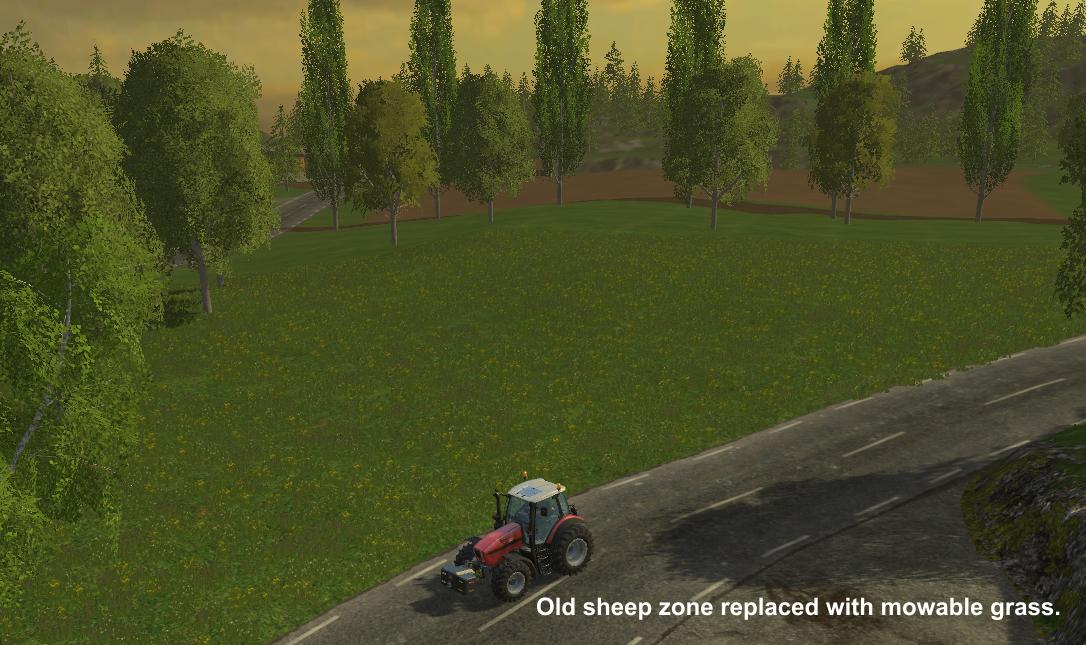 The old cow zone has been replaced with more logging on slightly flatter ground than usual. The old sheep zone has been replaced with mowable grass. You start with mid-ranged machinery and I have changed a few of the fields close to the main farm to take into account the larger machinery startup.