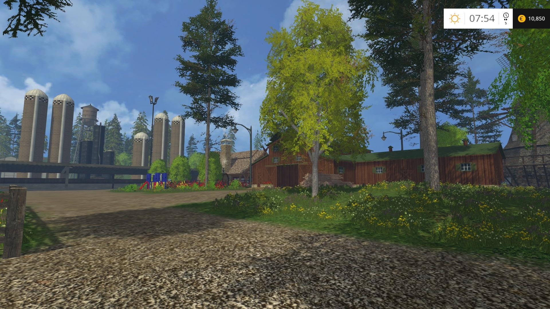 There are 3 farms, 1 small forestry area and one huge which is entered from field 19. The whole map boundary was moved back for this area and it’s my favourite part of the map. The trail is large and great fun to drive with the modded pickup truck. Night lighting is applied to the baseball field, main farm and the Biomass plant. Waterfall and lake extension at the town park. 1000’s of trees with custom textures have been planted around the map and the fir and spruce look superb due to a photoshop tweak. A good selection of starting equipment will get you farming straight away(see photo’s. The Garden center has been move to the center of the map behind the equipment store. There’s more you’ll just have to look.