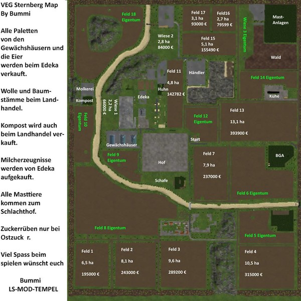 As Sternberg is located in Mecklenburg, the map is rather flat. She has 18 fields of which you must buy some.