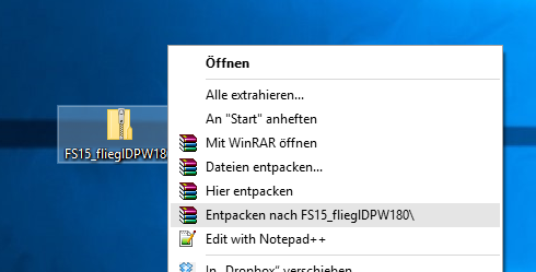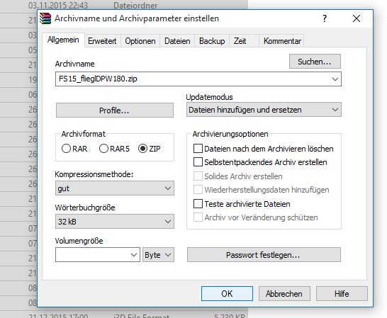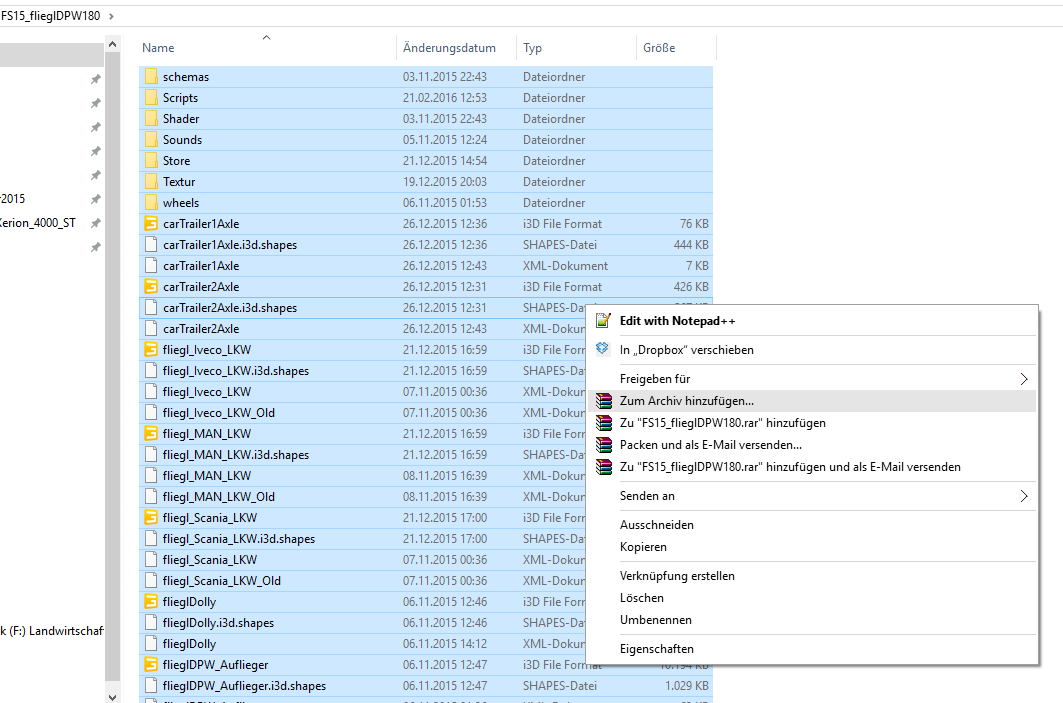 5. Geht nun wieder ein Ordner zurück (FS15_flieglDPW180). Dort alles markieren (Strg + a) und dann mit Winrar ein Rechtklick auf das markierte und dort auf “Zum Archiv hinzufügen…” klicken.