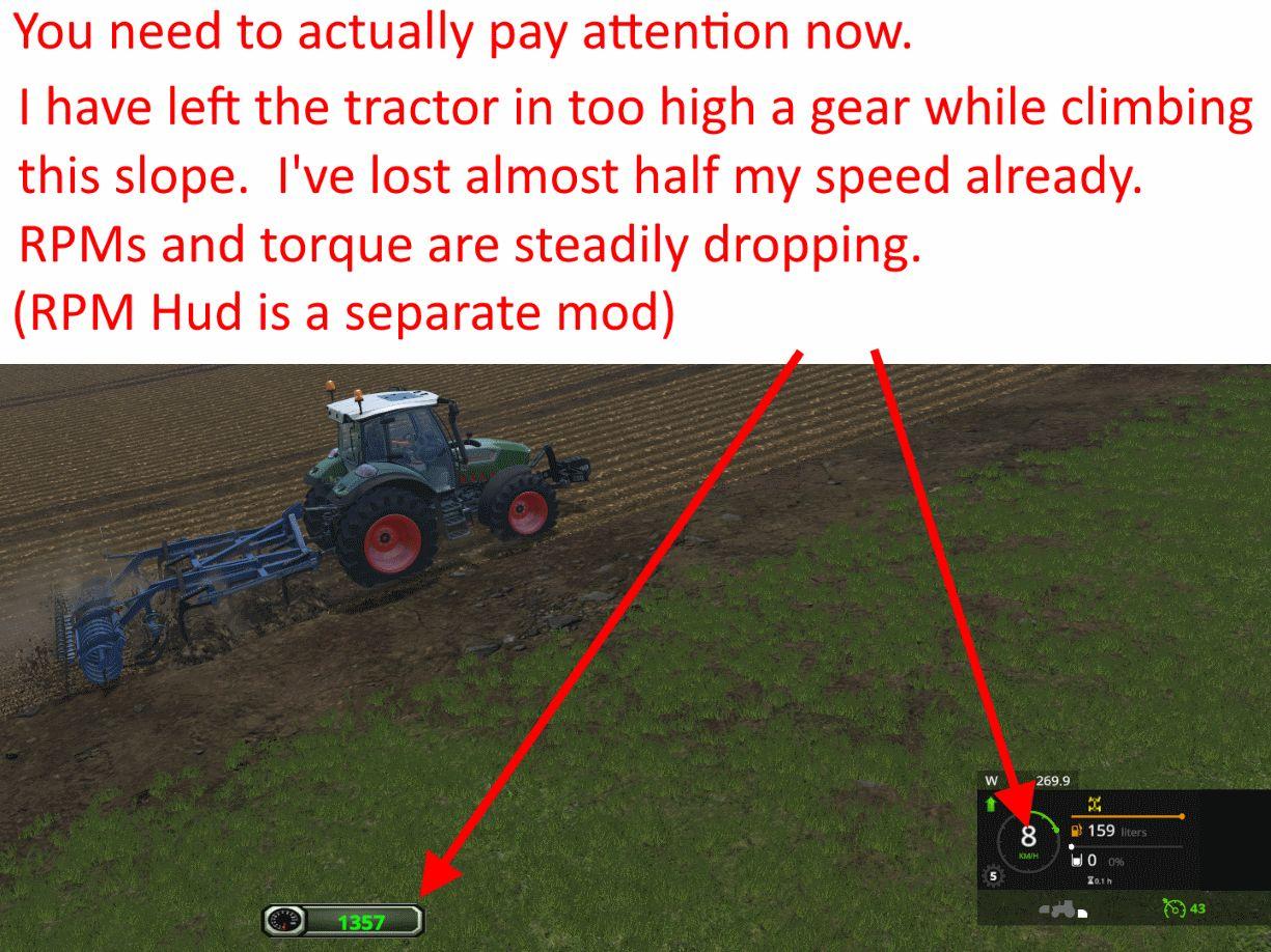 The gears make field work more interactive, particularly on sloping terrain. With the default system, you just engage cruise and wait till you reach the end of the field. The CVT automatically does it’s best to deliver peak performance. I would probably enjoy that in the real world, but in a game it isn’t adding any fun factor for me. It takes simplicity too far. The novelty of simulated farming wore off a long time ago. I found myself getting bored instead of relaxed when playing. With BasicGears, you need to pay attention and shift gears as needed to maintain the best possible performance when doing field work. It adds that little something that was lacking before, and playing is actually fun again.