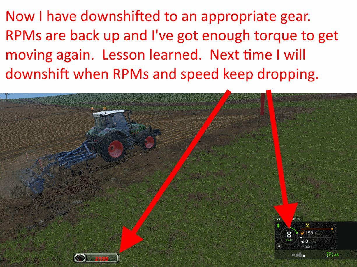 All the tractors have from 8 to 10 forward gears, depending on the top end speed. 3rd gear on all tractors will run at 10 km/h to match speed with Giants combines. 7th gear runs at 30 km/h to match speed with AI traffic.
