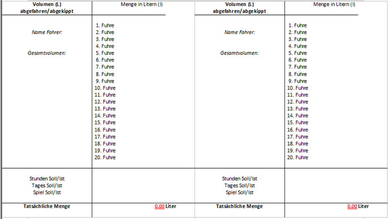 Die digitale Version kann auf einem zweiten Bildschirm oder einem zweiten Laptop angezeigt werden. Das Dokument rechnet die “Tatsächliche Menge” aus den insgesamt 20 möglichen Fuhren aus. Weitere Rechnungen müssen allerdings trotzdem “per Hand” gemacht werden.
