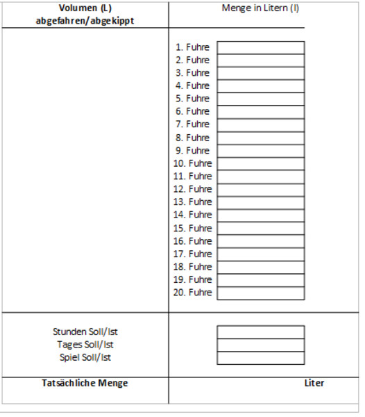 Die digitale Version kann auf einem zweiten Bildschirm oder einem zweiten Laptop angezeigt werden. Das Dokument rechnet die “Tatsächliche Menge” aus den insgesamt 20 möglichen Fuhren aus. Weitere Rechnungen müssen allerdings trotzdem “per Hand” gemacht werden.