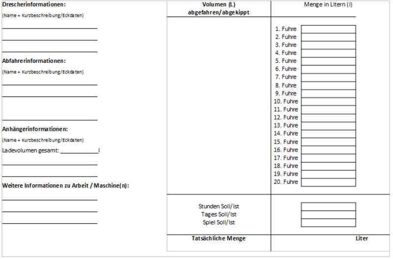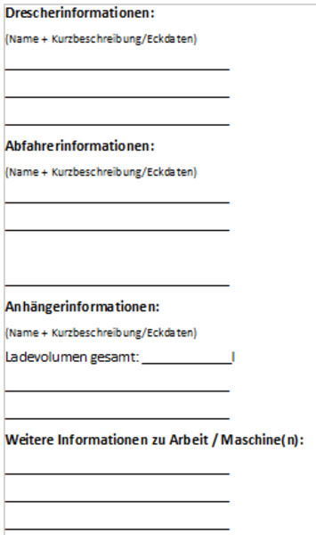 Ihr könnt in dieses Dokument die wichtigsten Eckdaten zum Drescheneintragen, und wisst sofort, wer welches Fahrzeug, mit welchem Anhänger und welchem Ladevolumen fährt.