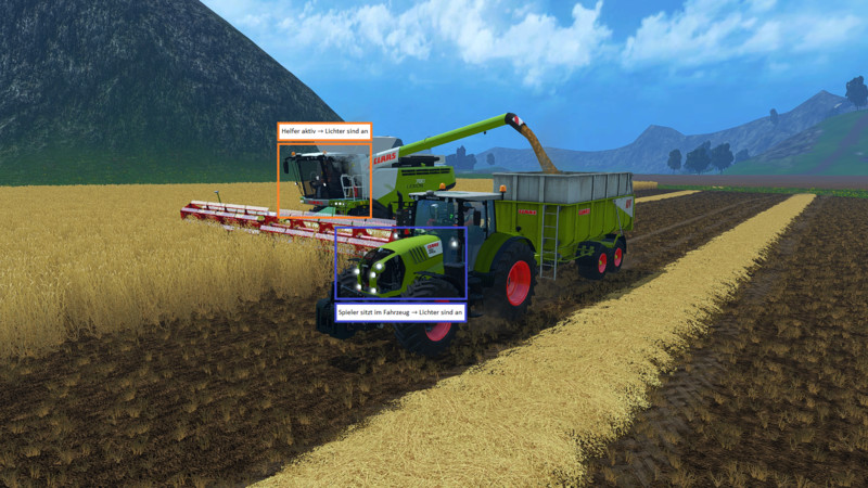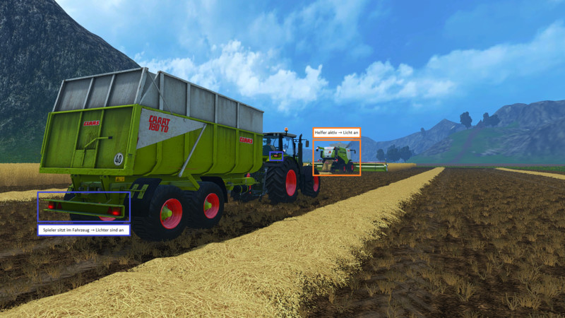 the vehicles a new function similarly to the brake light extension is added. As it concerns here not the stoplights, but the front and rear lights. Once the player, an assistant or a script such as FollowMe is at the wheel of a vehicle, the standard lighting (1x button F) is turned on to this. Here are only the Coronas without actual light source appears.