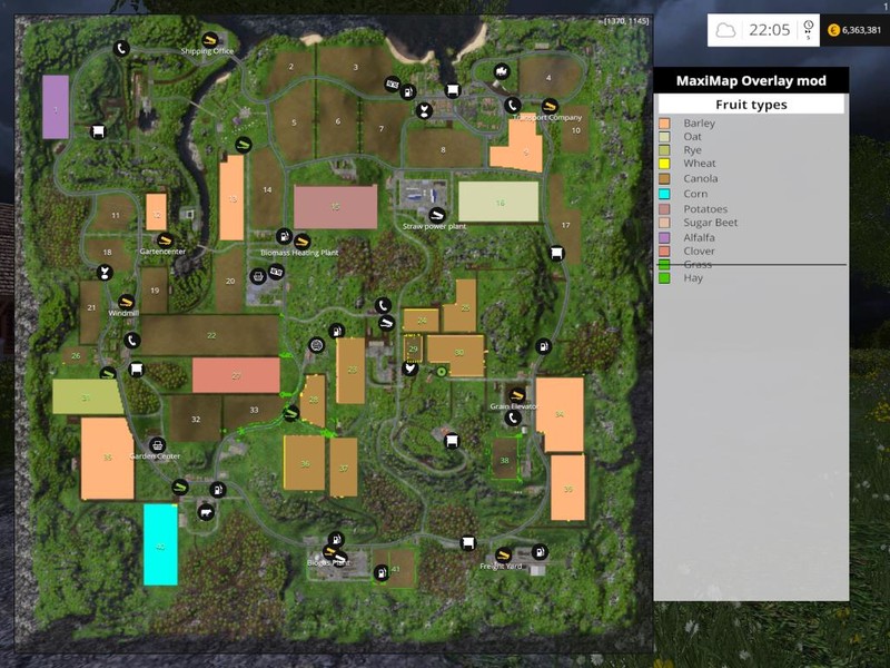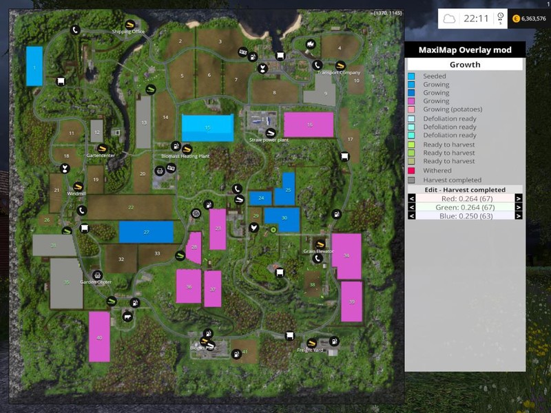 In addition to showing the fruit-types and growth-states of crops in the maximized world-map, this mod also allows you to customize the colors of fruits and growth-states.