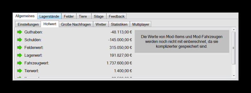 Played days, compacted bales, weather, future demands, evaluation, Hofwert and the total value (animals, vehicles, items, storage content), place in the ranking …