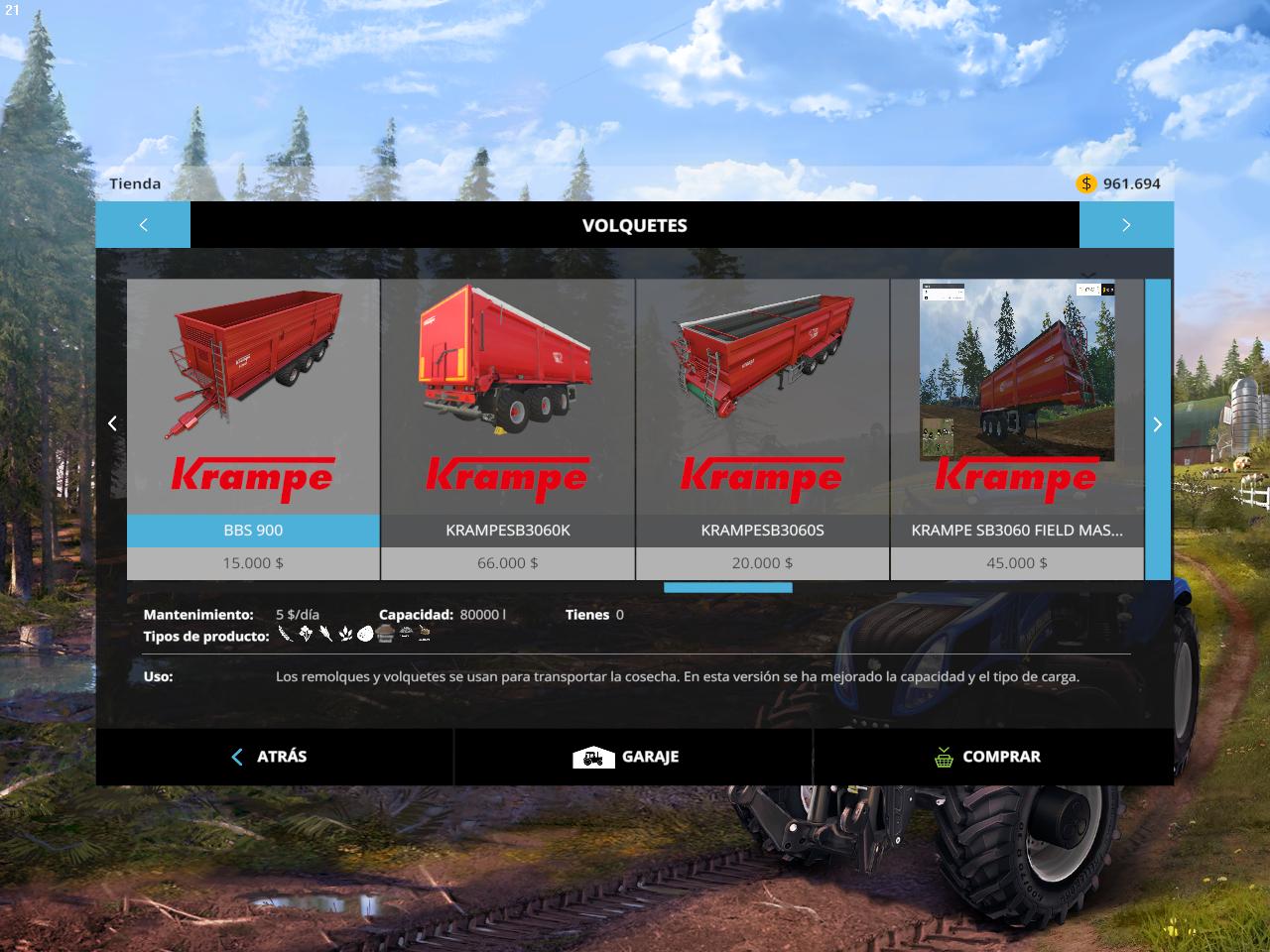 Hello I offer a version of trailer krampeBBS900 brand, where you can carry in addition to wheat maize rape potato chaff and maps with sand, cement and gravel and can move, has a capacity 80.000 liters.