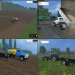The mod includes a GAZ-53 and GAZ-53 standart.komplektatsii- 120 hp, 82 km / h, lighting fixtures, lights headlights, turn signals, brakes, axle dust, road marks, color choices in the first wash. Body clings to 5000 liters, transports: wheat, barley, canola, corn, sugar beets, potatoes, grass, wheat straw, barley, chaff, silage, fodder, foodmixture, wood chips, manure, wool, sand, choice of color, clean. Two clings barrels, one for the transportation of gasoline ATZ-3.8 (3800l), clean. The second for the transport of water and milk ATSPT-3,3 (3300l), clean. Sprayer “Dawn 3000-02″ (test) volume (3,000 liters) and clean-trailer truck which can also cling modules, choice of color, clean.