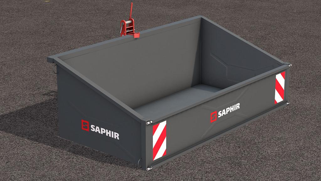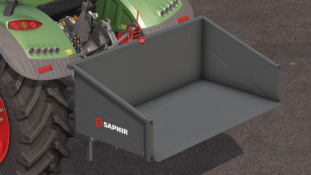 The TL 200 of the company Saphir is a transport container that can be used for transport of all kinds. With a maximum weight of 750kg, pallets can also be loaded and secured with straps. The device is mechanically tiltable and can be attached to any tractor with a Cat I or Cat II attachment.