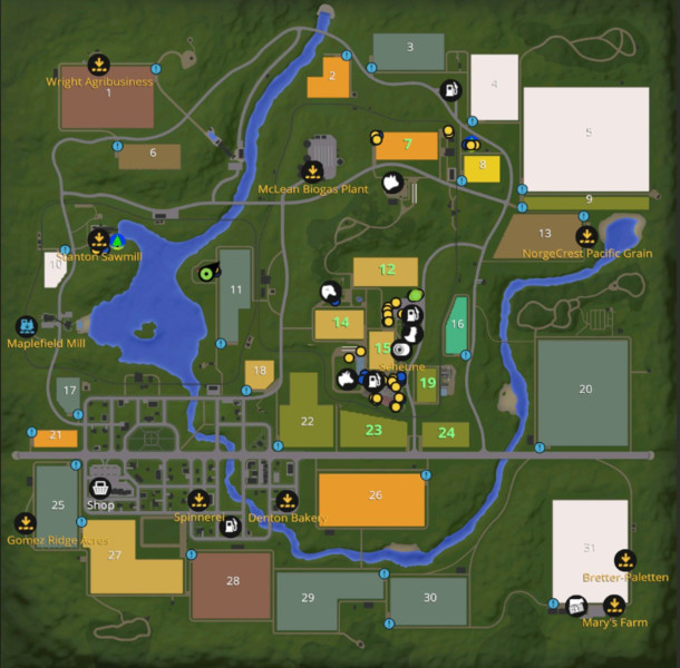 Bei den folgenden Stellen – Hofsilo, Central Transport Hub, GoldCrest Pacific Grain und MapleField Pool können zu den Früchten Weizen, Raps, Mais, Gerste, Sonnenblumen und Sojabohnen, nun zusätzlich auch Kartoffel, Zuckerrüben und Hackschnitzel geladen oder abgeladen werden.
