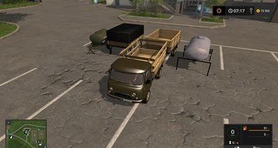 UAZ-3303 operating dashboard, strokes and parking lights, animated driver in the cabin UAZ. trailer modules, module tanker seeds and fertilizers (before filling the lower side of the mouse), the module-barrel water-1500L,
