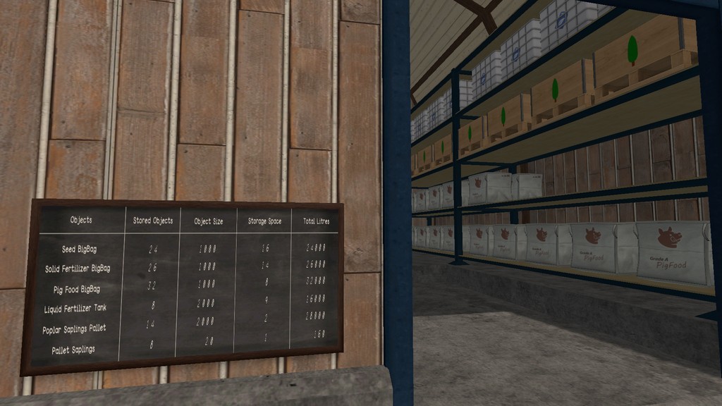 General Storage Barn: Seeds, Fertilizer and PigFood (40 of each BigBag), 16 Poplar Pallet, 17 Liquid Fertilizer Pallet and 9 Tree Sapling Pallet.