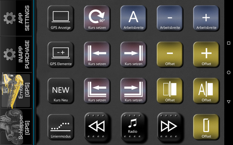– Auf der Linken Bildschirmseite befindet sich das herkömmliche Grid mit den Grundfunktionen des Traktors und die 3 wichtigsten GPS Funktionen. Durch wischen nach rechts erreicht man die GPS Einstellungen.