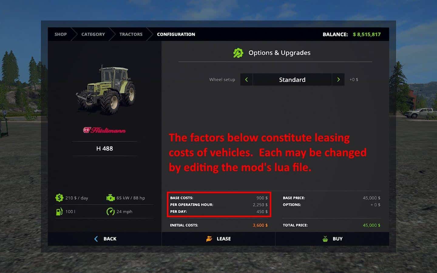 (1) Mod allows for adjustments to any of the three cost factors (Base Costs, Per Operating Hour, or Per Day) that make up total leasing cost, within the mod’s lua file. These are in the form of percentages of the respective vehicle’s underlying cost.