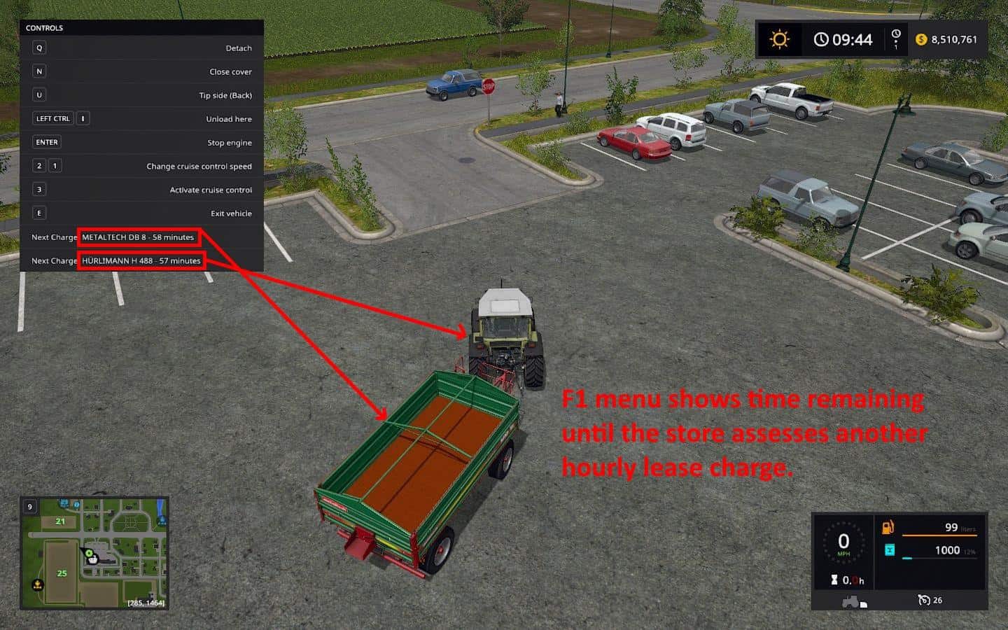 (2) Mod shows (in the F1 help menu) the player how much time remains until the next hourly lease charge. Want to know how much time is left so as to time your run back to the store? Just turn on the F1 menu and you’ll see how much time you have.