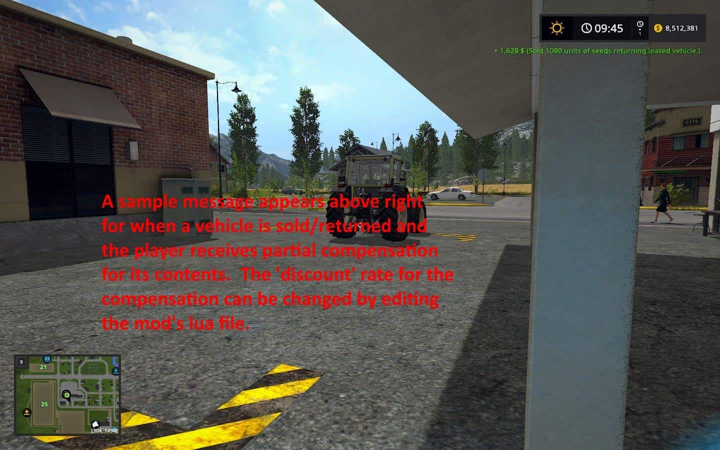 (4) Mod compensates the player (at a discounted rate) for any leased/owned vehicle that is returned/sold at the store that contains product inside (ie, such as grain, wood chips, seeds, etc.). The compensation amount will be at a discounted rate to account for the hassle factor’ to the store of having to dispose of the product. The discount rate can be adjusted if the player wishes in the mod’s lua file.