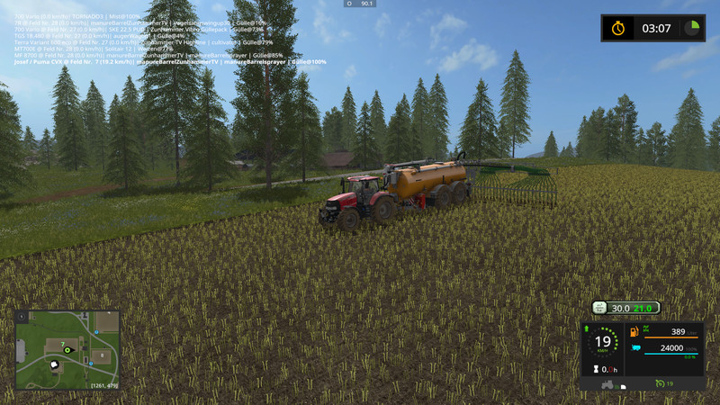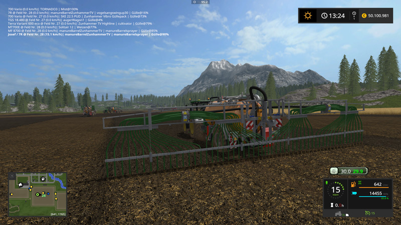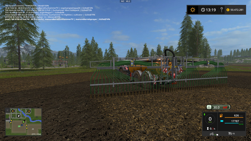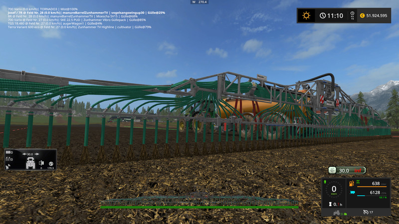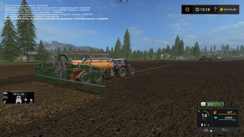 Now for the Ausbringgeräten. In all dispenses between 10m3 / ha and 40m3 / ha can be selected. This appears in a Hud. The application rate is kept constant, no matter how fast you drive. You may like to check. Thus a precise fertilization is possible. I also have the Particle inserted from the manure as you can see in the pictures. The map must be sure not vorbeitet because his GIANTS standard feature. Thus, should work on each MAP. I like it. The dribble bar and Carriere’ve got a Paritclesystem on the hose ends.