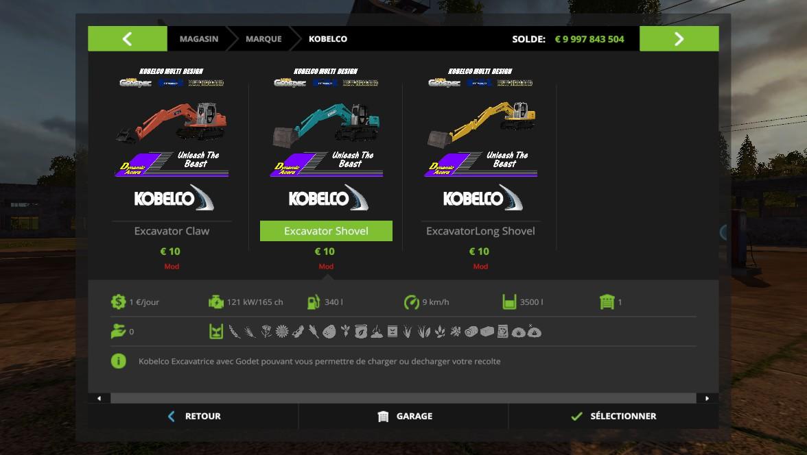 Bonjour a tous, je vous presente le Pack Kobelco dans sont Integralité pour Farming Simulator 2017 sous un Nouveau Jour, Remerciment a Titi’s3D pour la remodelisation du model avec un aspect plus equivoque a son ancien aspect 3D, Contrairement a ce que j’avait fait a ce model sur FS15 en version Abateuse, j’ai reatribué le model sous son veritable aspect en version Godet 3 corps, ainsi qu’ un rajout d’une version godet 4 corps ainsi qu’une version a pince forestiere. Ce model avait vu le jour sous la peinture Kobelco SK 160 lc, mais apres mur reflection le model revoit le jour pour FS17 sous 4 peinture differente toutes changeable sur les 3 Model qui vous sont Proposé, Fiat Kobelco E165, New Holland Kobelco E165, Kobelco SK160 Dynamic Acera et enfin Kobelco SK160 Acera Geospec, La version a pince comprend une lame avant sur le pont a chenille vous permettant de pousser si dans le besoin vos tronc d’arbres sur le flanc, pour la version a godet elle accepte tous type de grains (culture), avec une capacité de 3500 L, godet inclinable selon vos travaux ou tache de travail, Une fonction Regime moteur est presente par la touche B , vous permettant ainsi de mettre votre engins a son plein regime moteur, sa vitesse est un peut exager pour un model a chenille mais elle vous permettra d’atteindre la vitesse de 15 Km/h, sur chaque model comprend 5 camera pour diversifier la vue et la facon de voir votre simulation dans un autre point de vue. Une grille forestiere est presente sur les 3 pelle avec possibilité de l’enlevé ou de la rajouter a vous de voir si elle vous est utile ou non, comprend 4 skin de pelle mais aussi 3 couleur pour la grille en fonction du choix apporter a la marque elle sont associer a la couleur de la cabine, Colision Presente sur : Roue, Tourelle et sur les bras donc soyer vigilant dans vos deplacement, Sur ce Je vous souhaite pleins de Bonne partie avec ce petit pack qui m’a ravi, j’espere qu’il en sera pour vous !