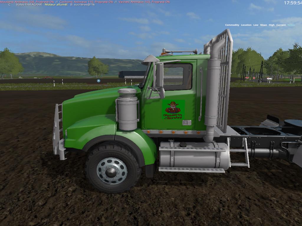 Voici le Truck + Trailer Farmers Market , the truck est un twinstar SX435 auquel j’ai ajouter 2 pancartes de chaque cote des portes , et pour la remorque j’ai pris des icone ou logo de la marque Farmers Market, la photo qui se trouve au devant de la remorque au niveau de la célète elle est positionner pour frigorifique, mais hélas elle reste a sa place quand ont choisi un autre modèle pour la remorque, mais rien de grave. Vous devez décompressez le fichier pour obtenir les 2 mods truck / trailer , Et pour finir la Capacity: 50000 L.
