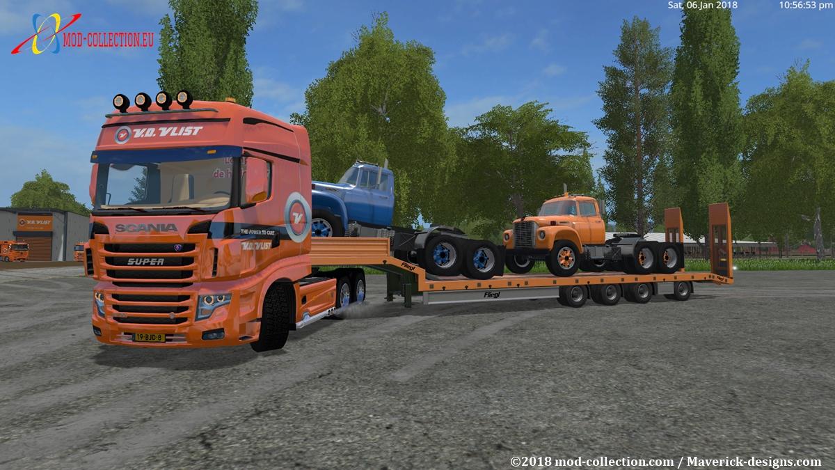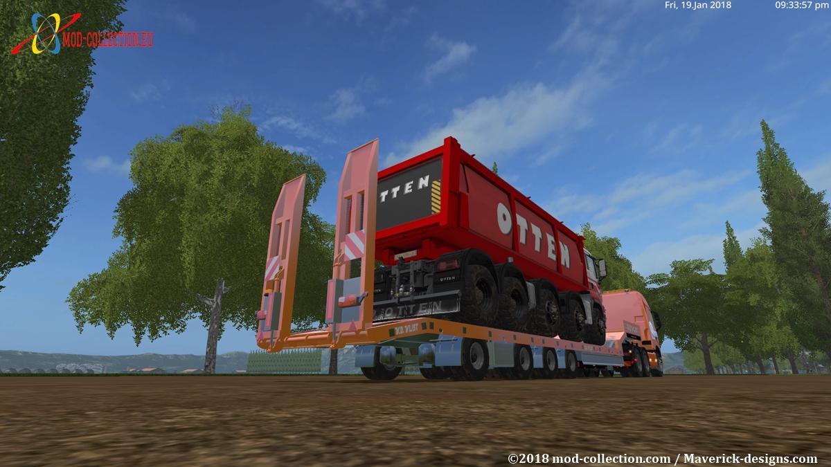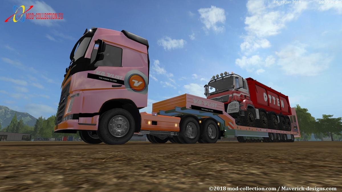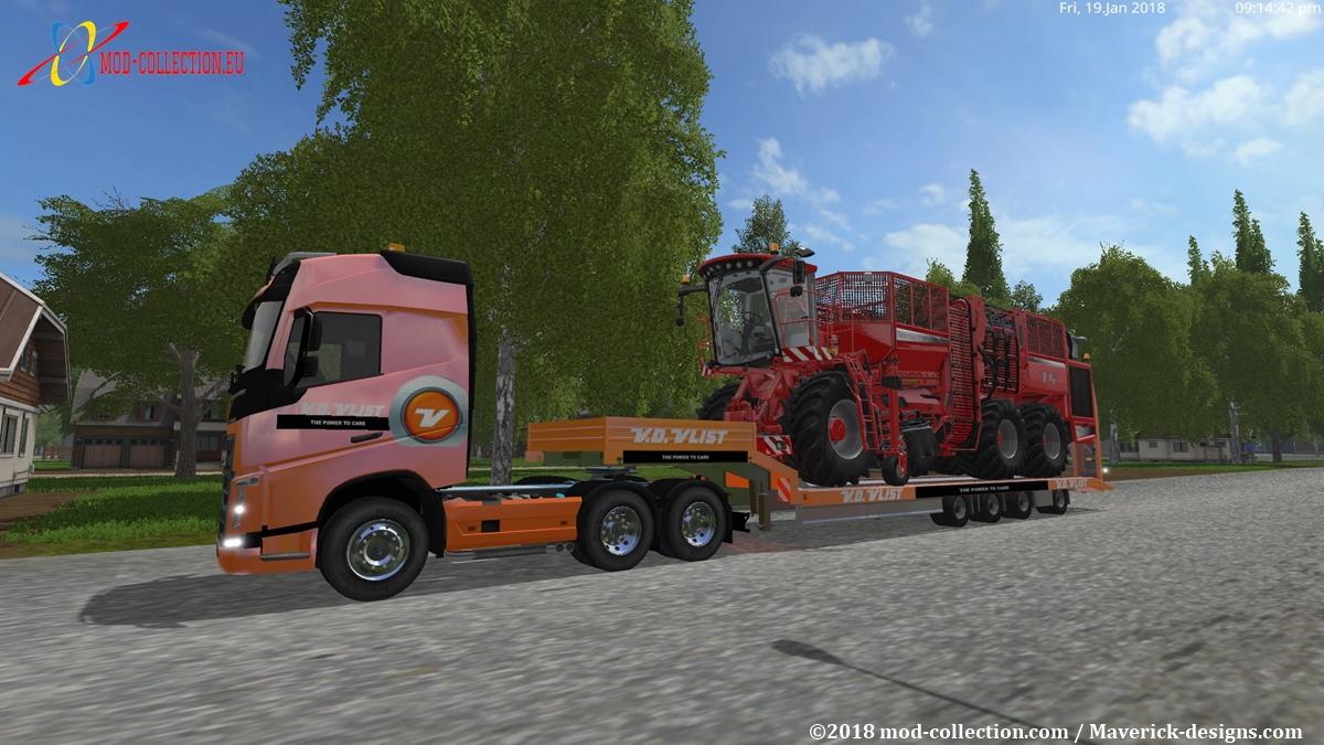 This is the last package that belongs to the van der Vlist theme. This package consists of a semi-trailer for cattle, a semi low-loader, a Volvo FH16 (improved version) and a Dump truck with a capacity of 1,000,000 liters.