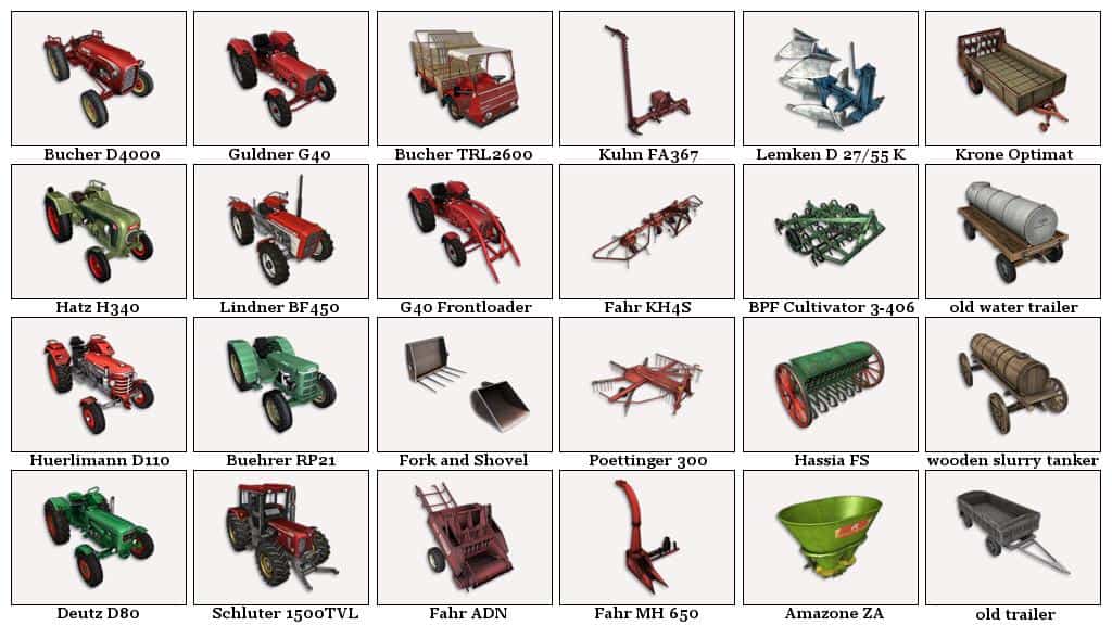 This is a conversion of the GIANTS FS-15 Farming Classics DLC. This is a collection of historical tractors and tools from the 1960s.